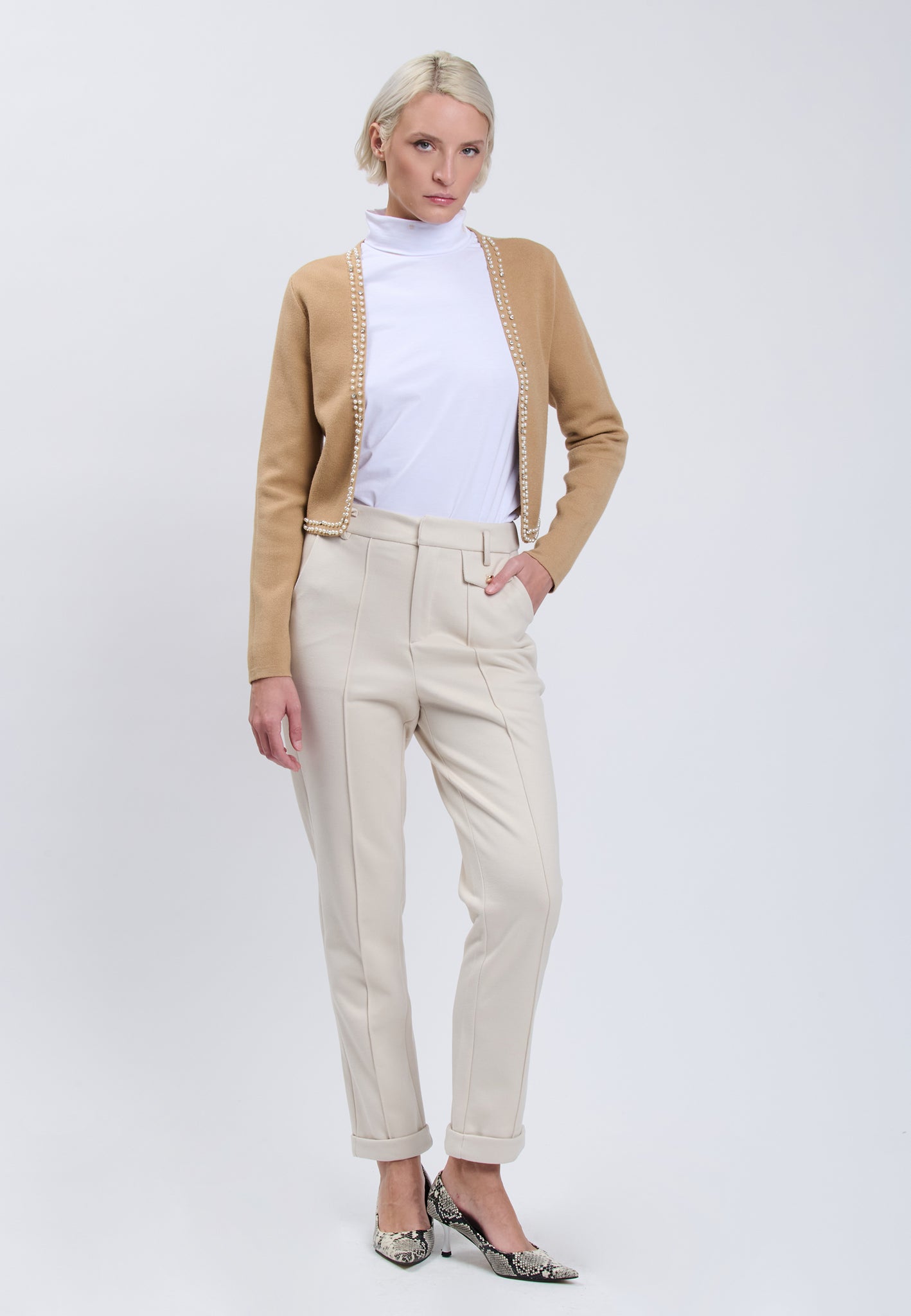Realizzato in un morbido e caldo filato in misto viscosa, questo cardigan corto in stile bolero presenta bordi impreziositi da perle e strass.