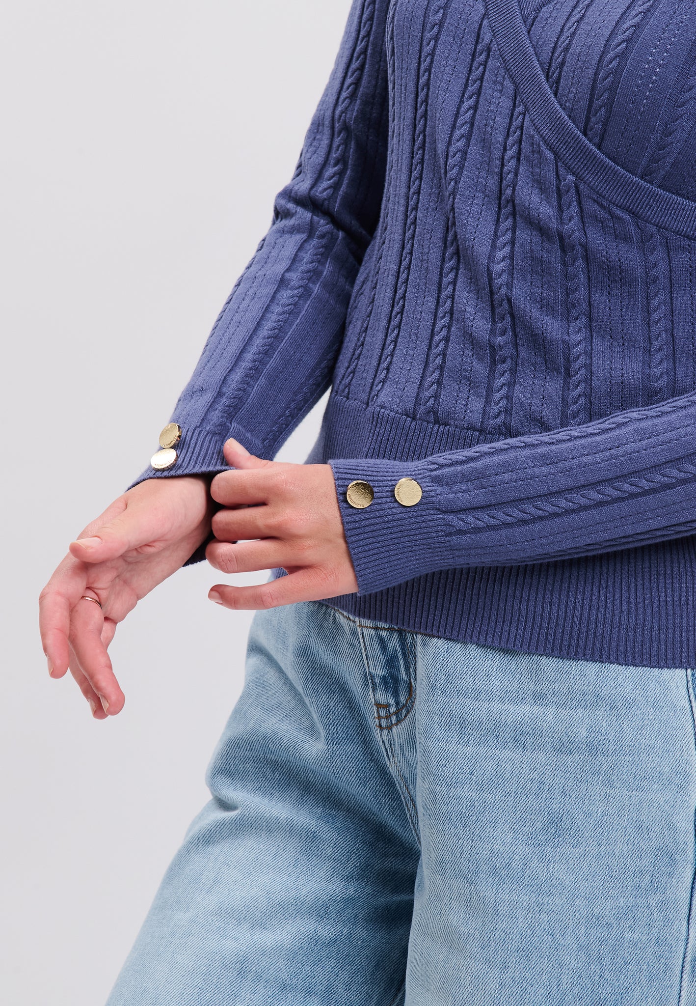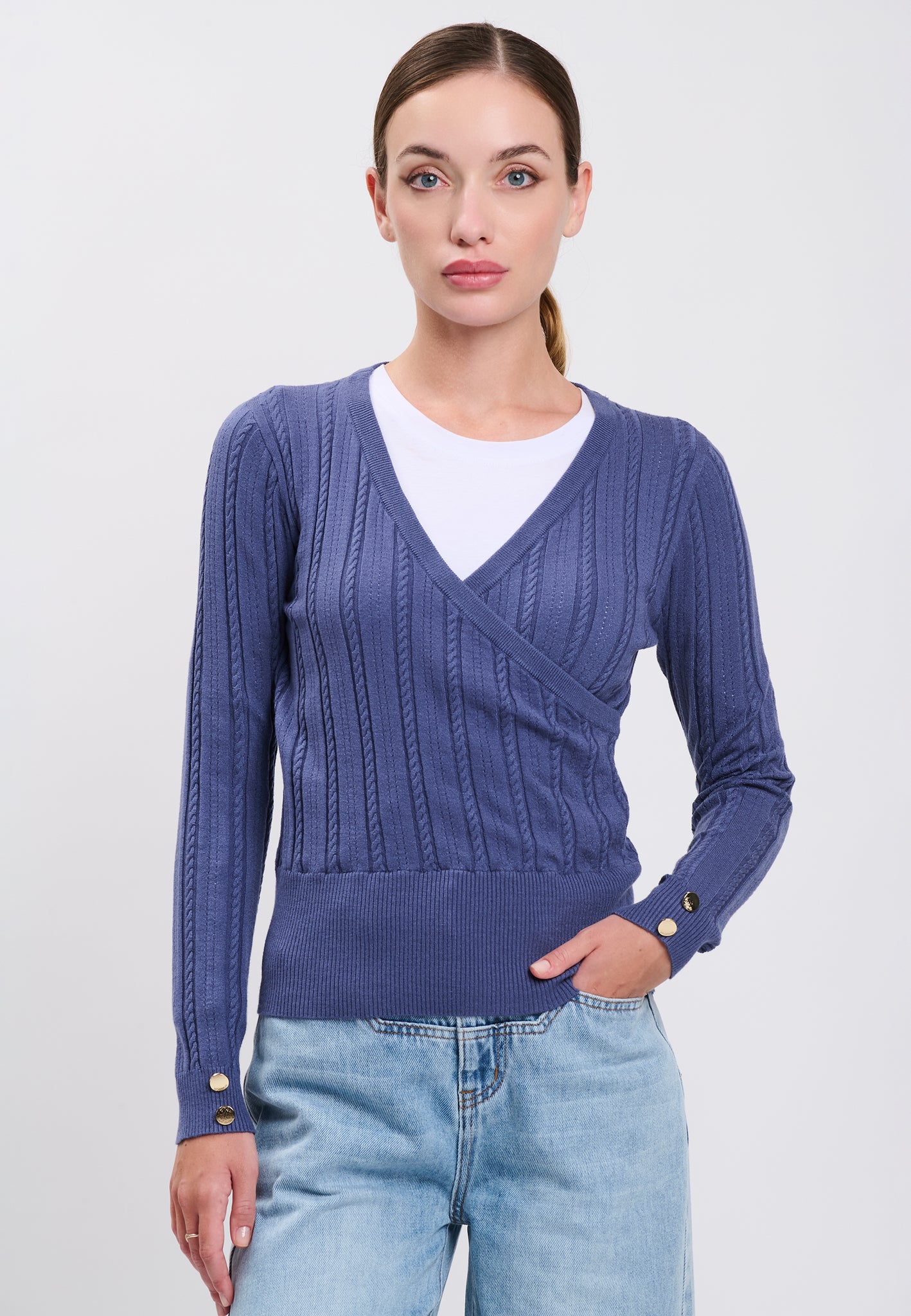 Questa maglia a incrocio si impone come un capo versatile e contemporaneo da avere nel proprio guardaroba. La finta abbottonatura sui polsini, arricchita da bottoncini dorati con logo inciso, aggiunge un tocco raffinato. La lavorazione a trecce e gli orli a costine lo rendono un essenziale quotidiano, facile da abbinare indossata su una t-shirt a girocollo, a un jeans e sneakers per un look casual e pratico.