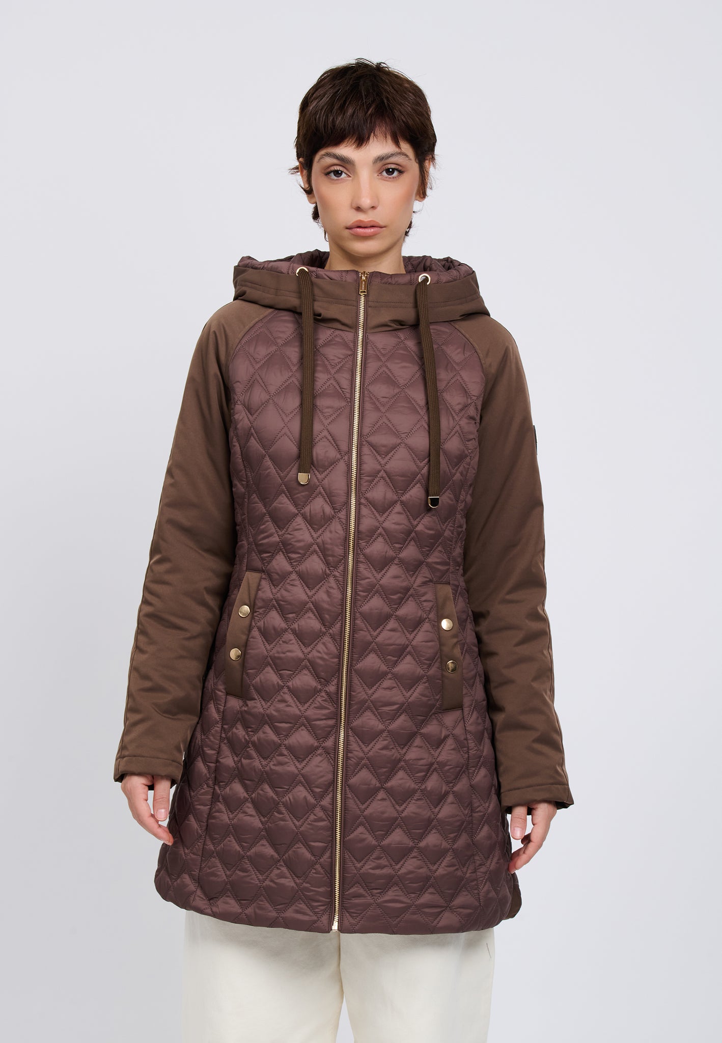 Questo piumino, con maniche raglan e taglio princess, afferma uno stile forte e deciso. Dettagli di ispirazione militare, cappuccio, trapuntatura a rombi: ogni elemento gioca sui contrasti per disegnare un look contemporaneo. Perfetto per affrontare l'inverno con praticità e stile.