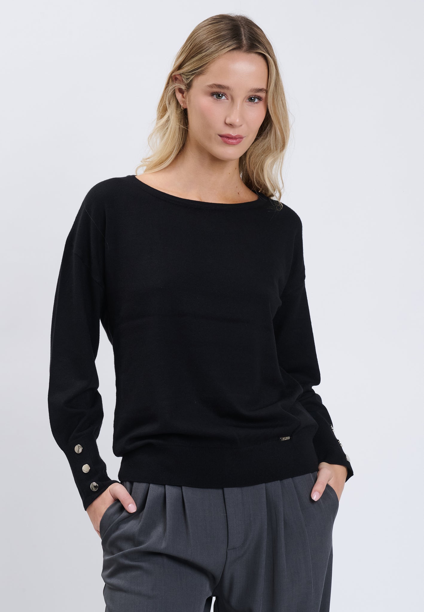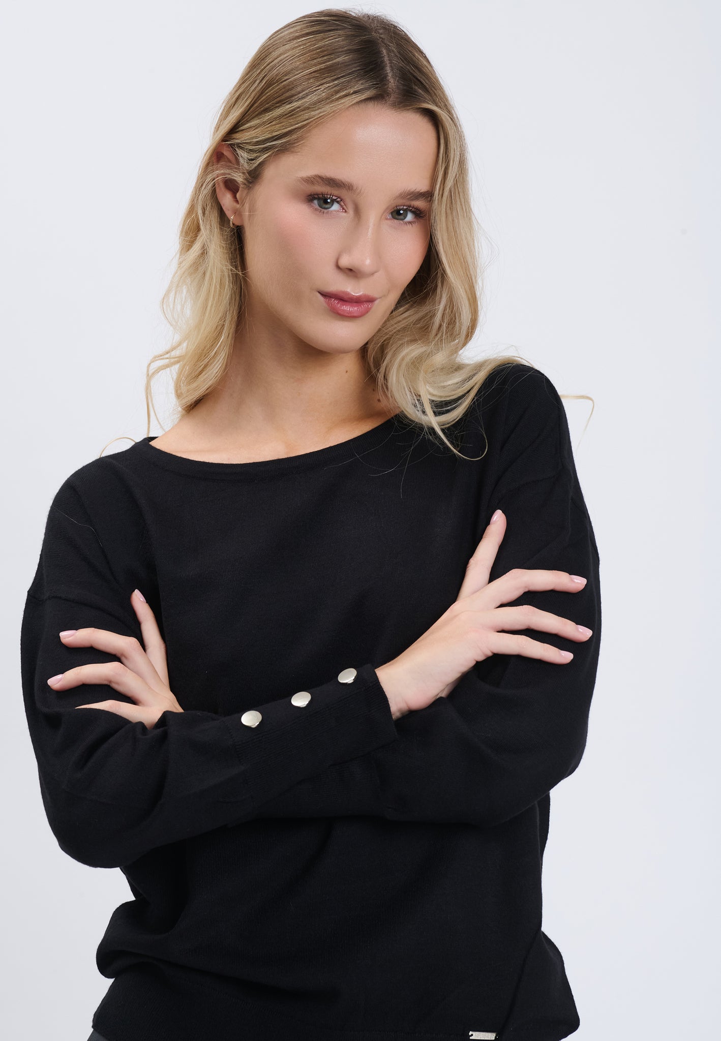 Questo maglione, realizzato in misto viscosa, è decorato con una finta abbottonatura sui polsini con bottoncini lucidi. Caratterizzato da un'ampia scollatura rotonda e da una vestibilità regolare e finiture a costine, è perfetto per valorizzare i look di stagione senza rinunciare alla praticità.