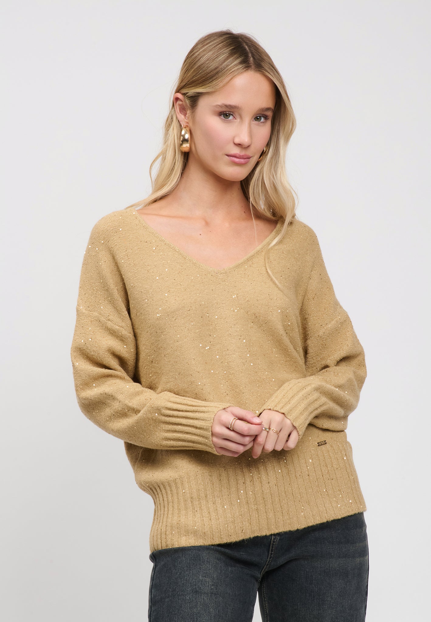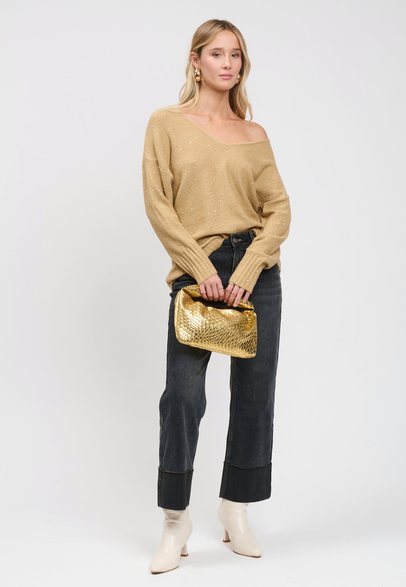 Nuovo capo essenziale del guardaroba, questo maglione con filato in misto viscosa-lurex e micro paillettes crea una silhouette comoda e strutturata. Ampia scollatura a V e loose fit, si presta per essere indossata su una camicia over e jeans o da sola su una minigonna per un deciso gioco di contrasti di volumi.