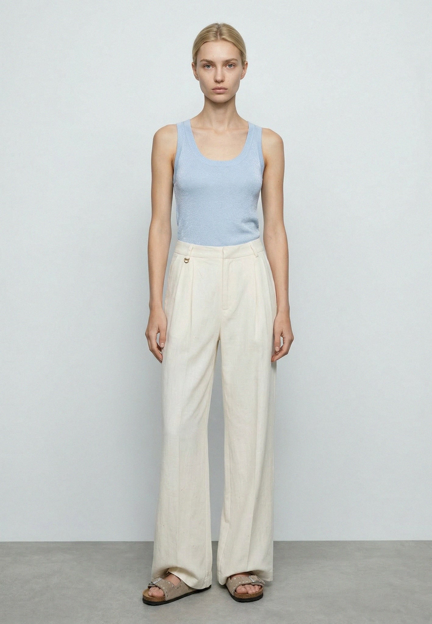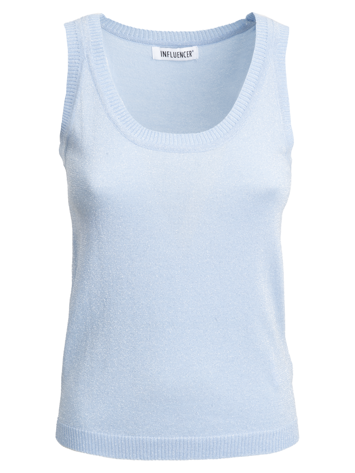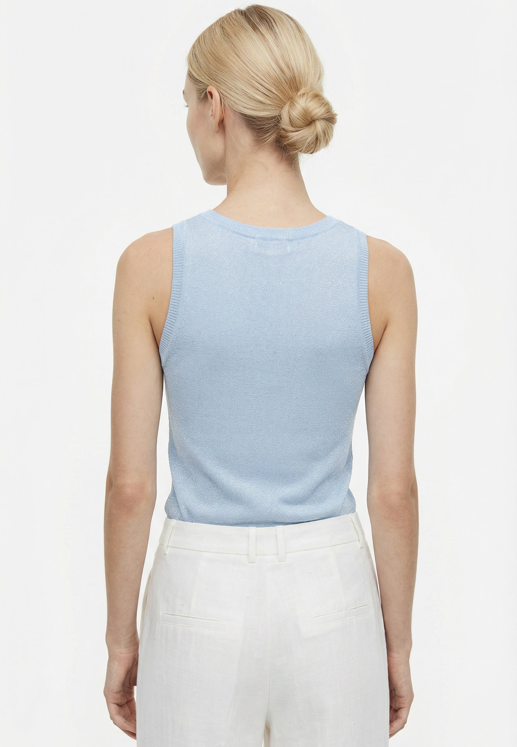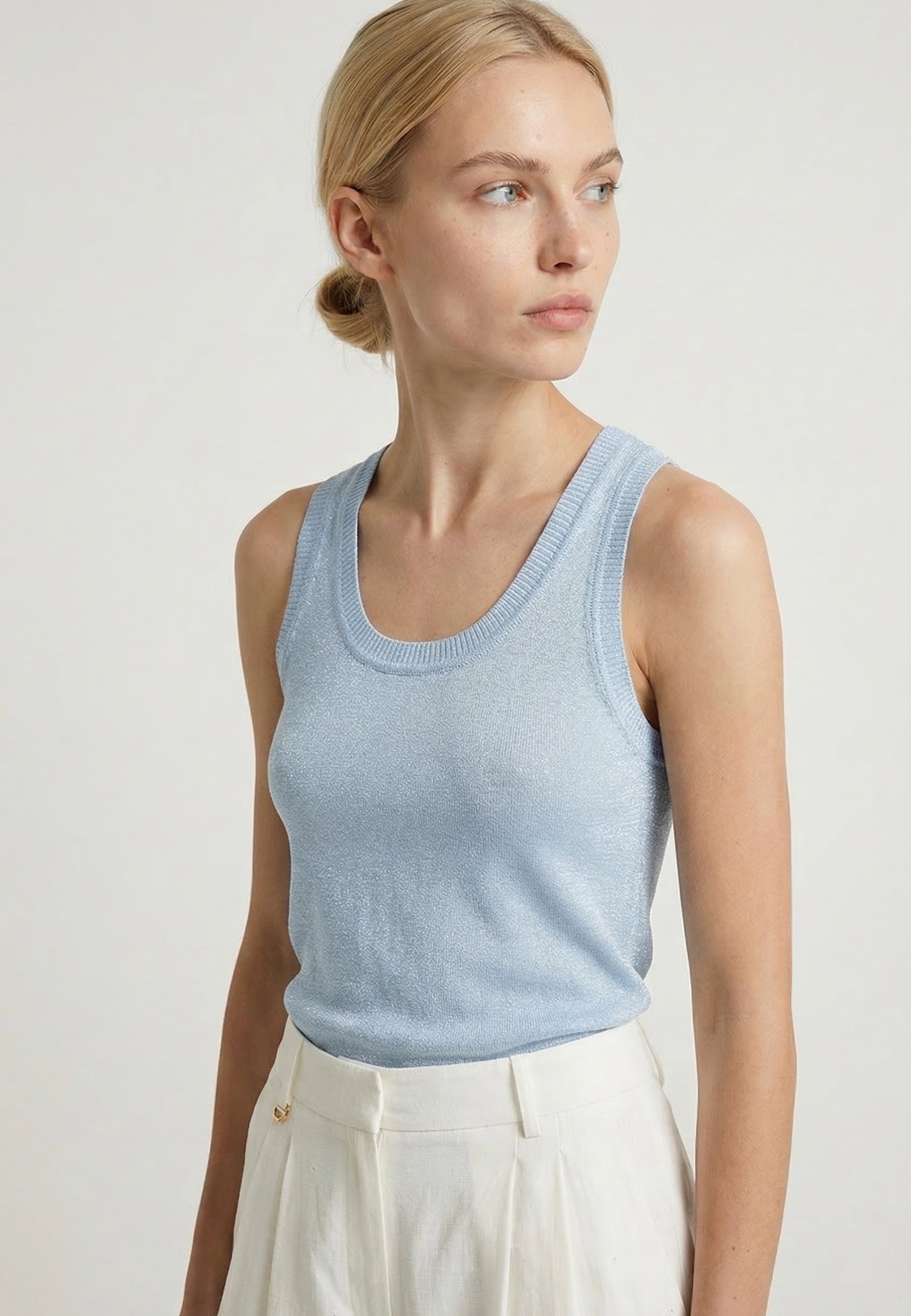 Aggiungi un tocco di scintillante freschezza ai tuoi outfit estivi con questo raffinato top in maglia lurex. Realizzato in una splendida tonalità celeste pastello, questo top senza maniche è l'ideale per chi cerca un capo versatile che unisca comfort e stile elegante, perfetto per passare con disinvoltura dal giorno alla sera.