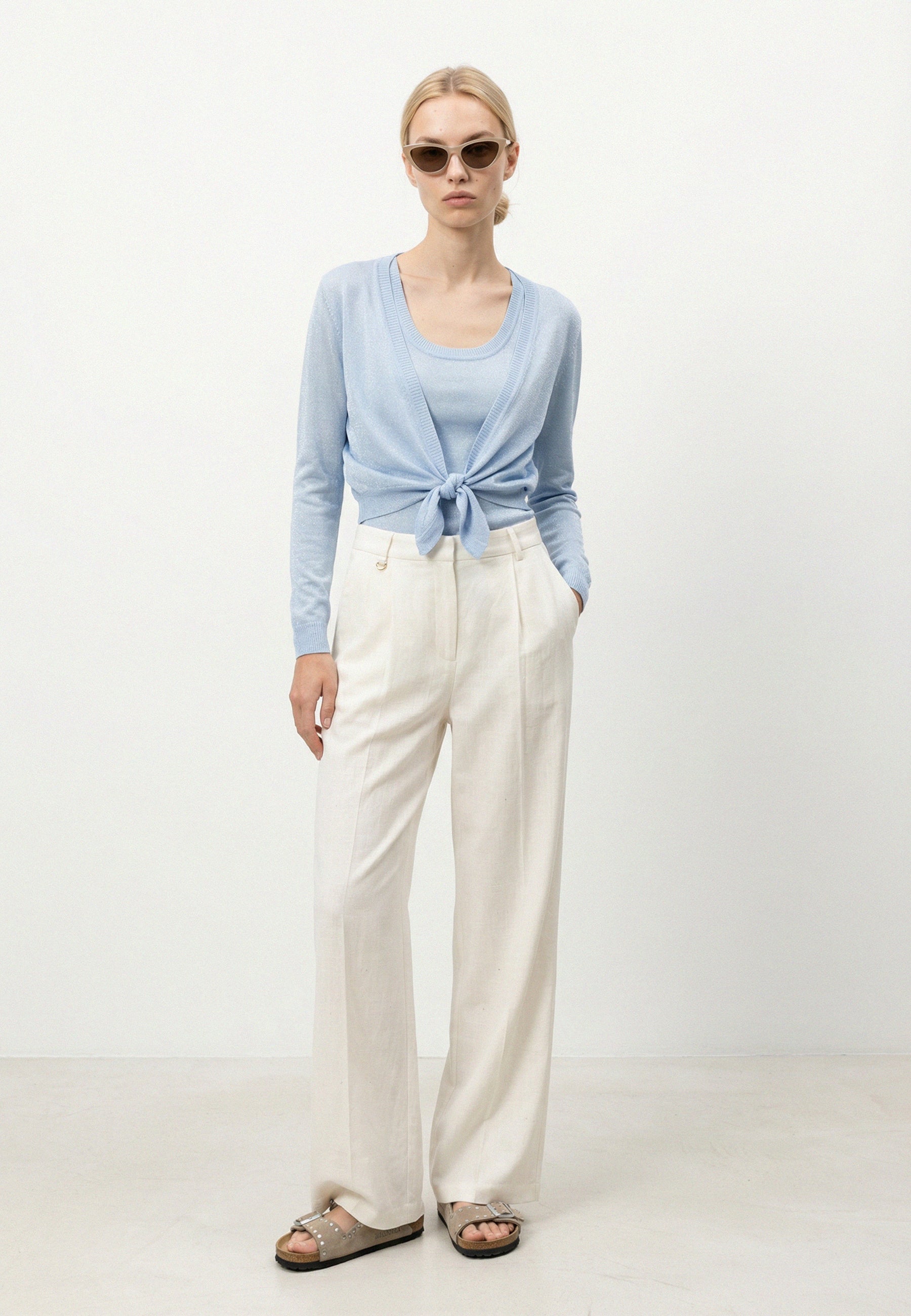 Per un look estivo e raffinato, abbina il top a un paio di pantaloni a vita alta a gamba larga in una tonalità neutra come il panna o il beige. Completa l'outfit con sandali flat in suede color tortora e, per un tocco finale di classe, aggiungi un dettaglio gioiello minimalista in vita o al collo. Per una serata, indossalo sotto un blazer leggero o sotto al cardigan coordinato.