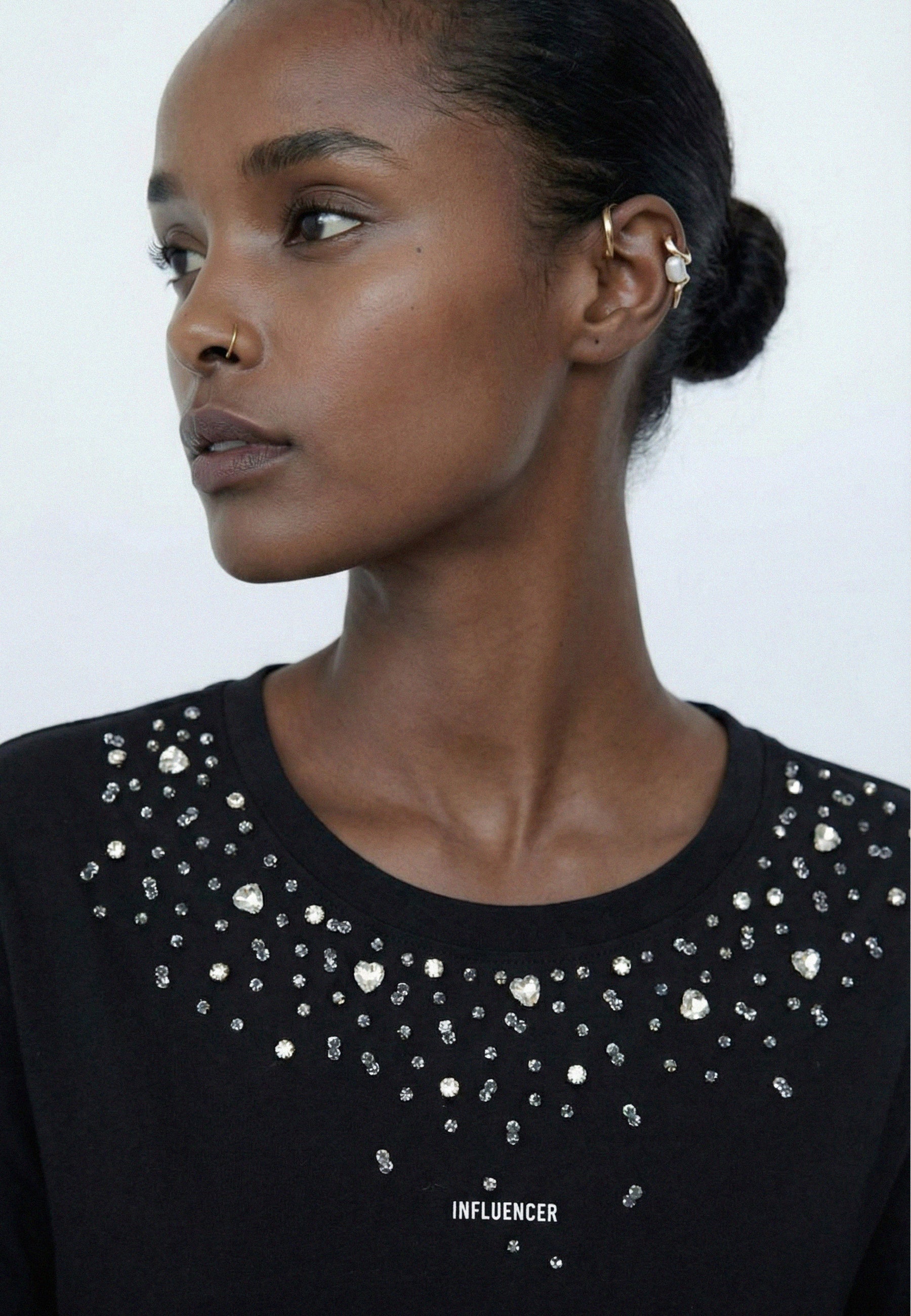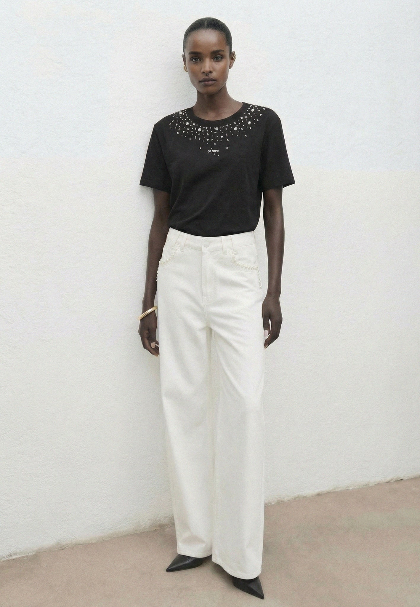 Questa t-shirt a maniche corte si distingue per il suo colletto con strass, aggiungendo un dettaglio chic e brillante a questo capo intramontabile. Con il suo taglio chic e casual, è la t-shirt perfetta per il quotidiano.