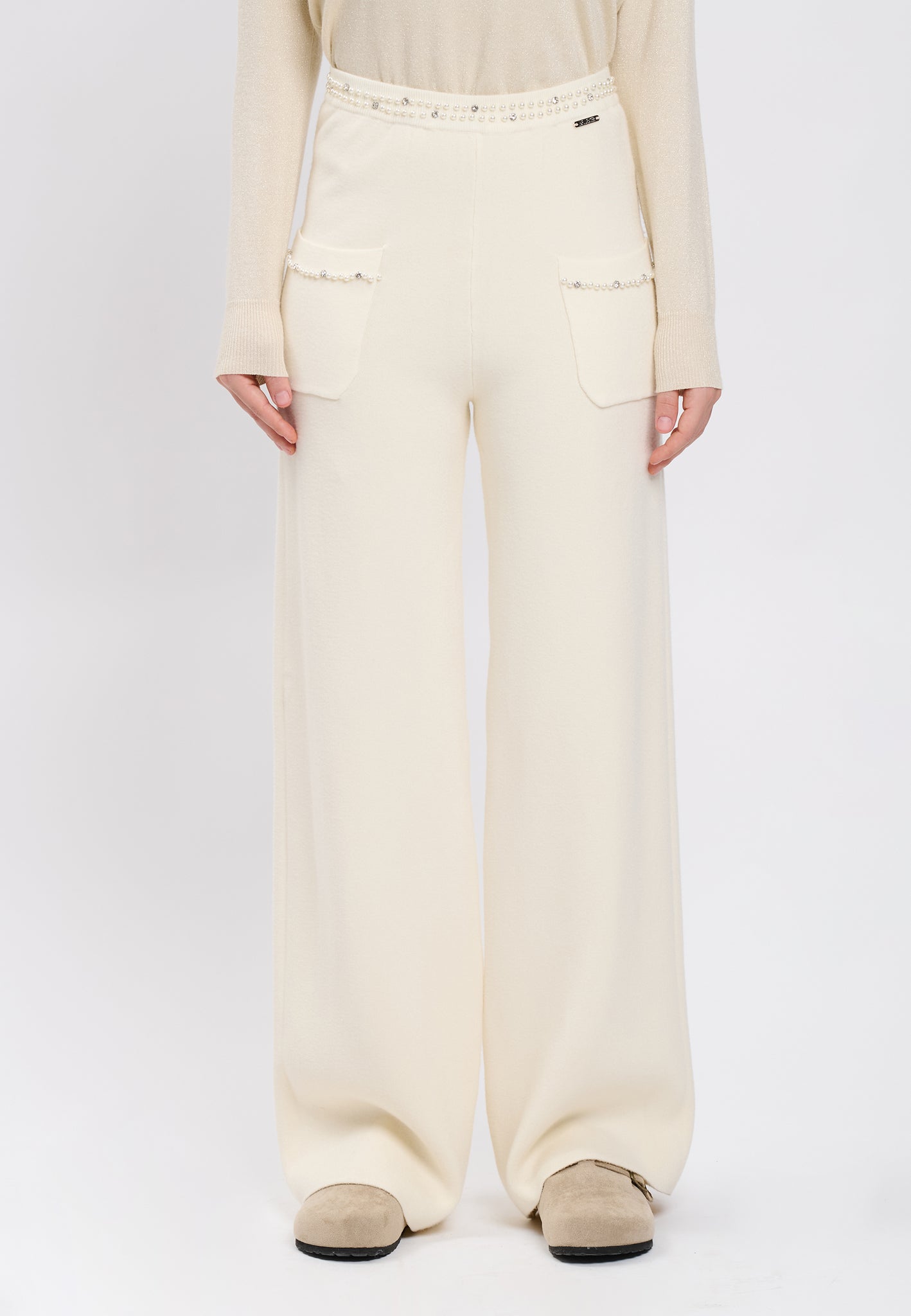 Questi pantaloni di maglia in misto viscosa presentano un taglio morbido a gamba ampia e una rifinitura con perline e strass sulle tasche a toppa, offrendo uno stile casual chic. La vita a costine elastica permetta una comoda aderenza al punto vita.