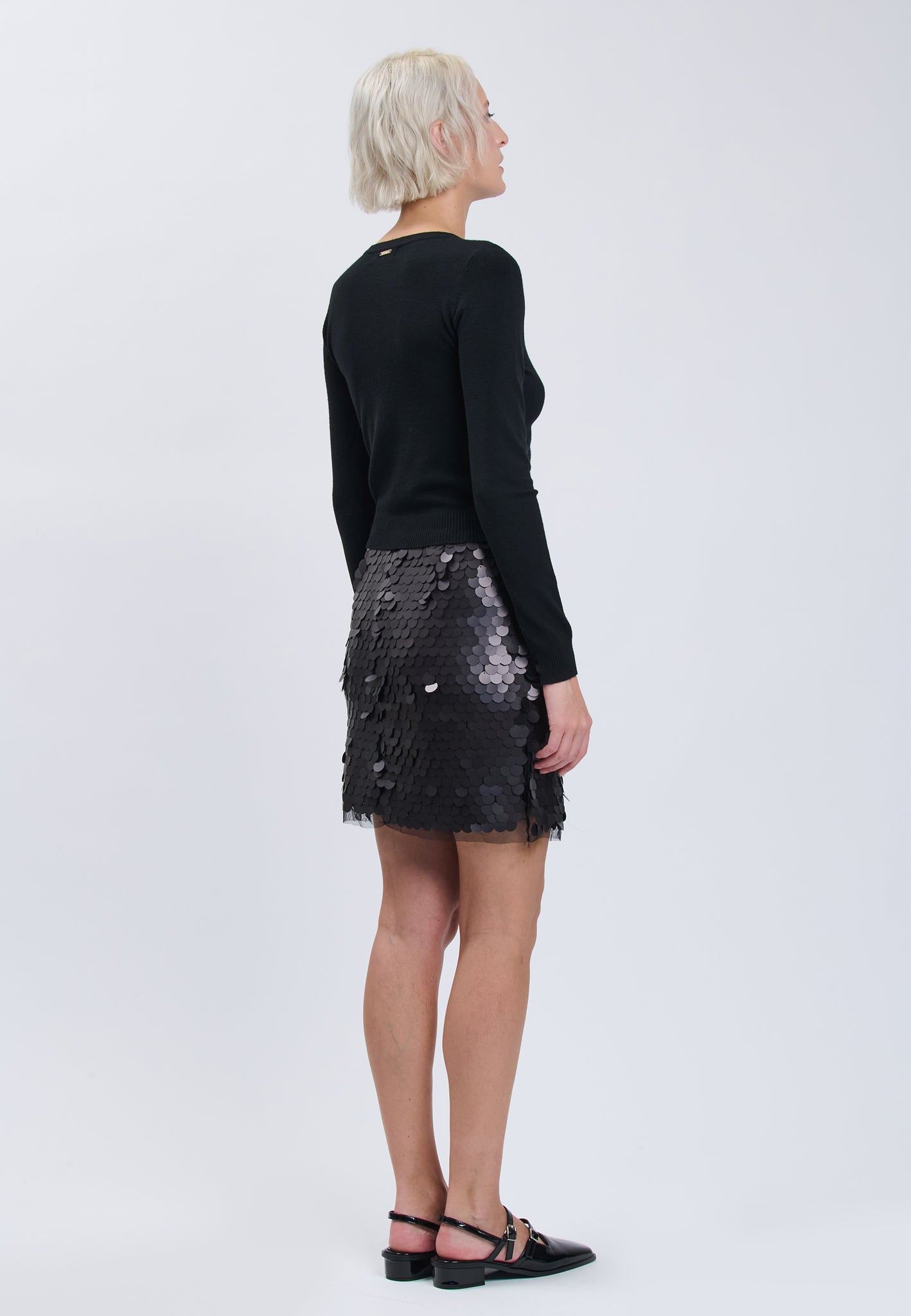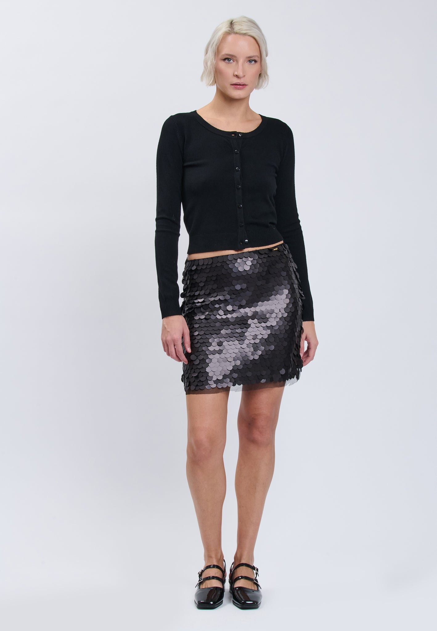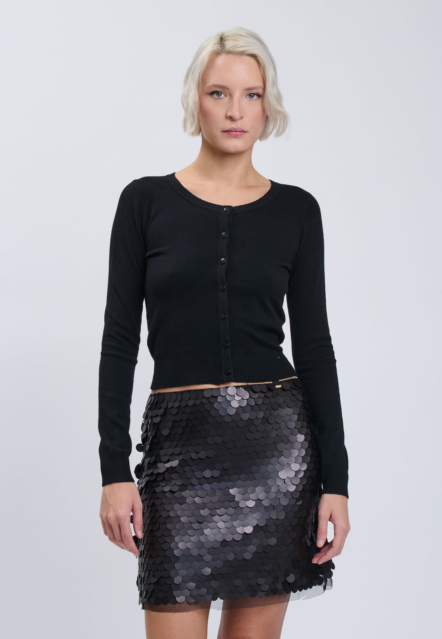 Questo cardigan corto in maglia rasata con filato in misto viscosa unisce finezza e leggerezza. Il suo girocollo e il fit aderente donano un tocco di dolcezza, mentre la chiusura con bottoncini in tinta permette un adattamento facile ed elegante.