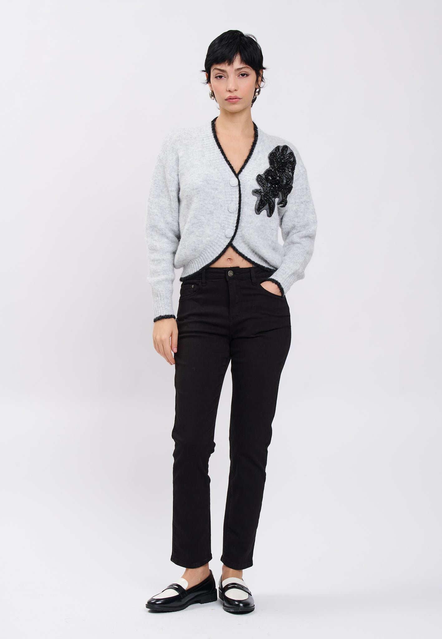 Un capo strutturato e grafico, che gioca sui netti contrasti per riscaldare la silhouette con modernità. Con i profili a contrasto e un bellissimo ricamo florale applicato impreziosito da perline, questo cardigan morbido al tatto afferma un look strutturato, ideale per la stagione. Da indossare con pantaloni neri e mocassini di vernice e da accessoriare con una borsa nera.