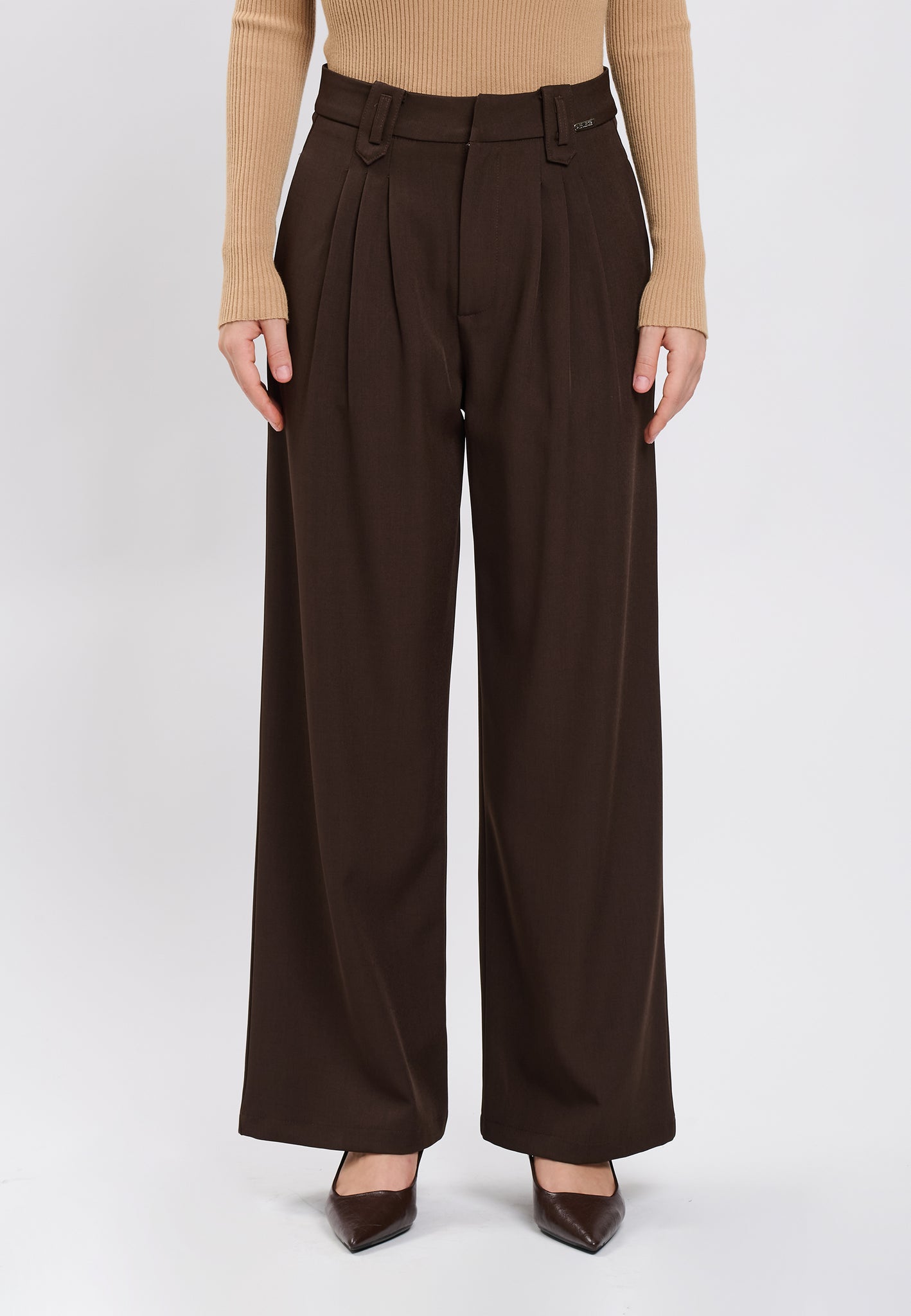 Questi pantaloni da completo, che sono un capo essenziale del guardaroba femminile, si distinguono per la loro vestibilità ampia e fluida. Hanno due tasche, e pieghe su tutta lunghezza che definiscono con eleganza un fisico strutturato.