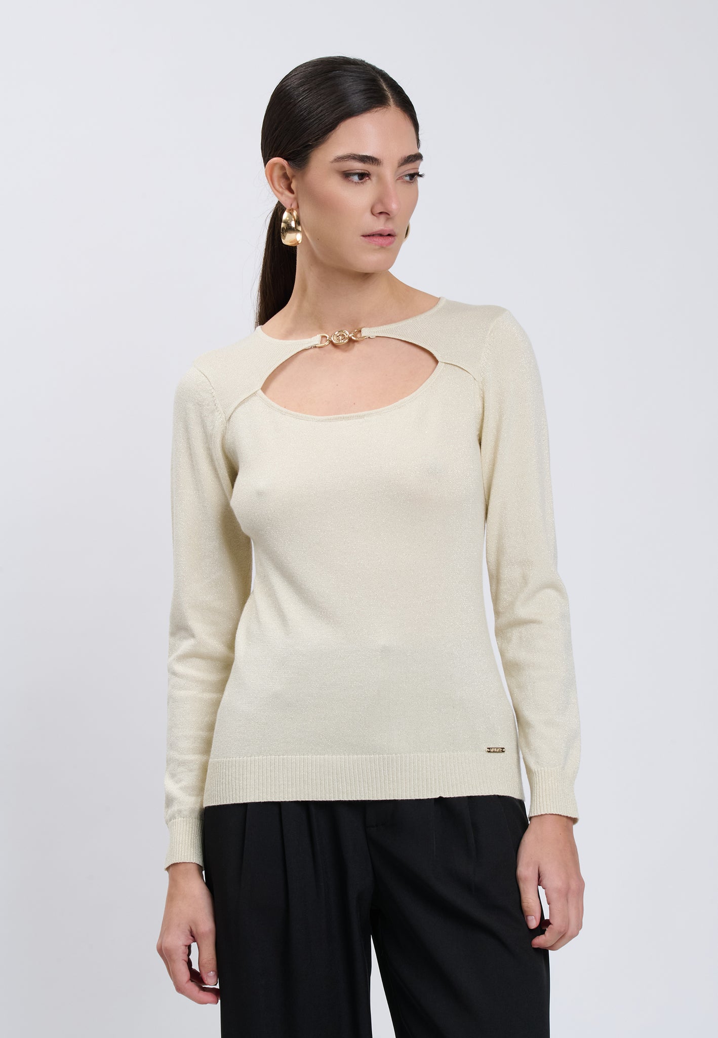 Questo maglione riflette uno stile femminile e raffinato tipico del brand. Realizzato in leggera maglia misto viscosa e lurex, presenta un sensuale cut-out messo in risalto da una fibbia logo dorata. Ideale da abbinare al un pantalone fluido sartoriale e accessori audaci per un total look raffinato e femminile.