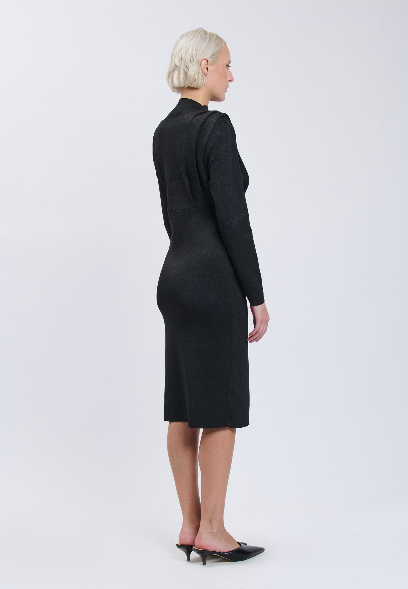 Giochi di luce e movimento controllato per questo abito in maglia lurex. Le pieghe che scendono dalle spalle e il taglio in vita catturano ogni riflesso, sottolineando una silhouette slanciata. Il collo alto mette in risalto le spalle con eleganza, mentre il taglio in vita garantisce una vestibilità avvolgente..