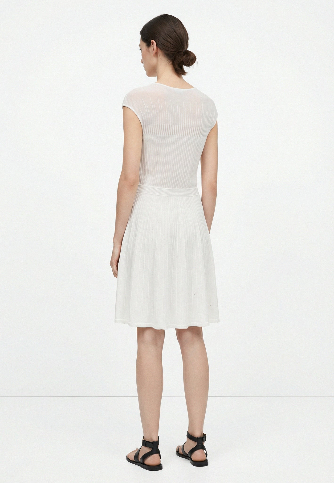 La lavorazione a maglia a costine verticali avvolge delicatamente la figura, creando una silhouette fit-and-flare (aderente sul corpino e svasata sulla gonna) incredibilmente lusinghiera. Il dettaglio distintivo è il carré superiore traforato con un motivo lineare e geometrico, che aggiunge un tocco di sofisticata trasparenza e leggerezza al design.