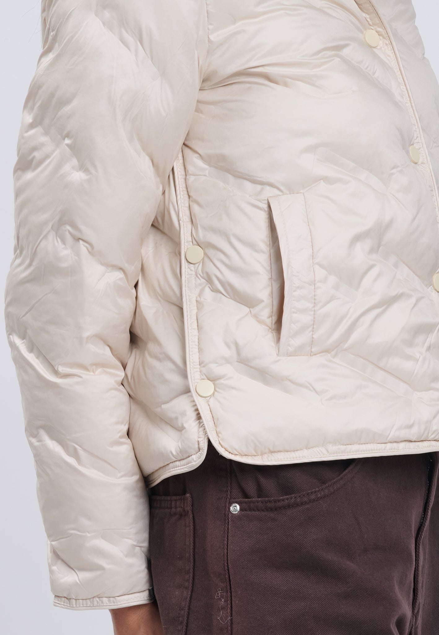 Questo piumino corto rivisita i codici classici con un taglio strutturato e finiture essenziali. Con collo alto e abbottonatura con bottoni a pressione, delinea una silhouette definita, sottolineata da una deliziosa trapuntatura a zig zag. Un capo da abbinare a jeans e sneakers e da scaldare con un morbido colletto in maglia.