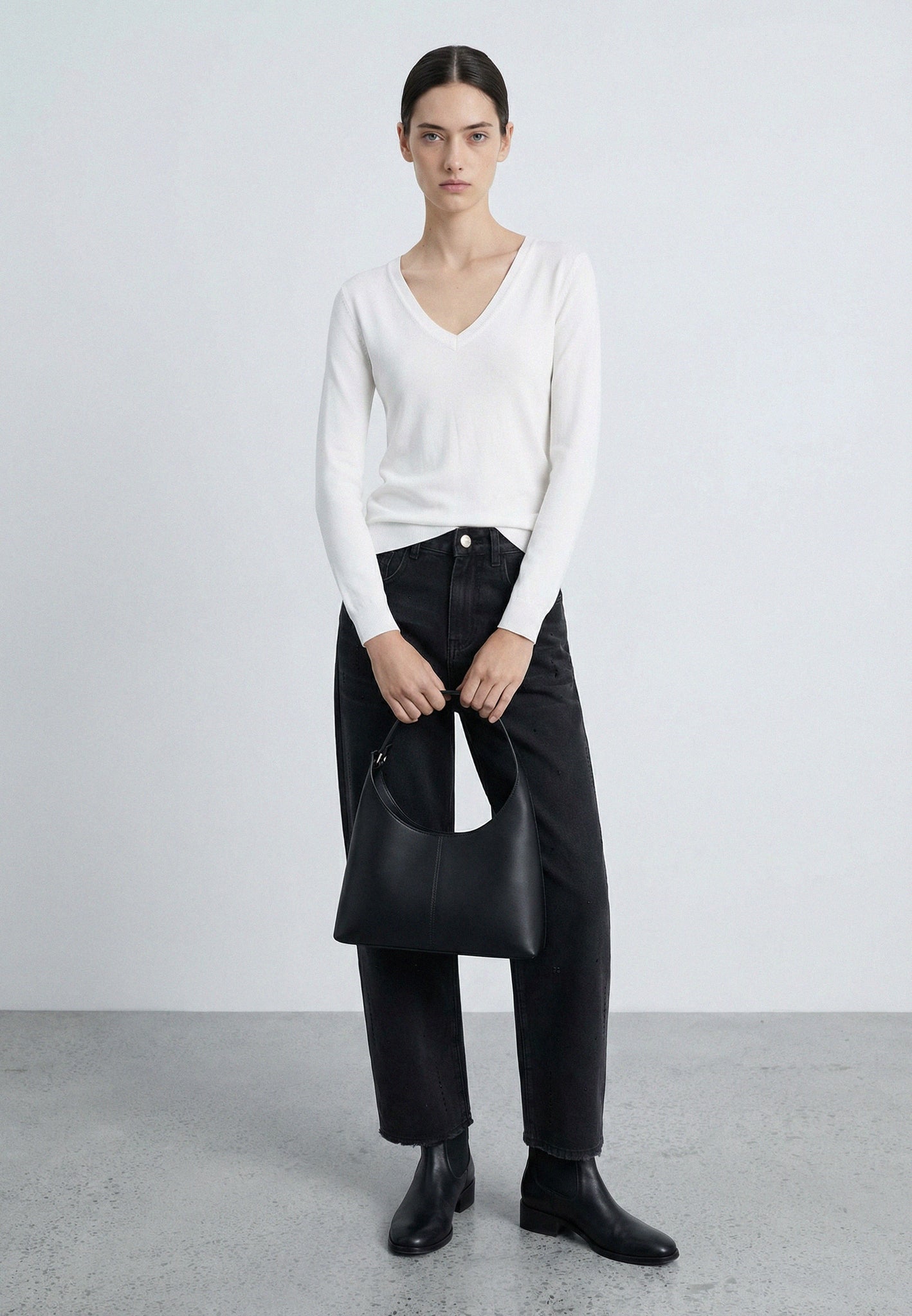 Il punto di partenza per ogni outfit impeccabile. Questa maglia basic a maniche lunghe e scollatura a V è l'essenza del minimalismo raffinato. Realizzata in un morbido filato misto viscosa, offre una lucentezza naturale e una texture setosa che scivola delicatamente sulla silhouette, garantendo comfort e traspirabilità per tutto il giorno.
