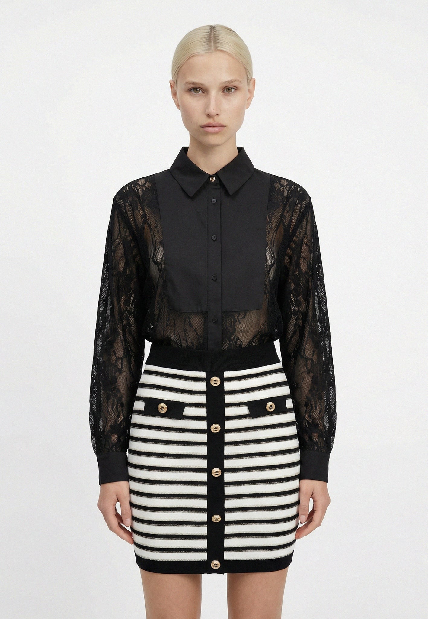 Questa gonna corta di maglia rivela una silhouette aderente, animata da un gioco di righe jacquard a contrasto, mentre le rifiniture lurex aggiungono un tocco di luminosità. Le finte tasche discrete e la vita elastica firmano un capo tanto pratico quanto straordinario.