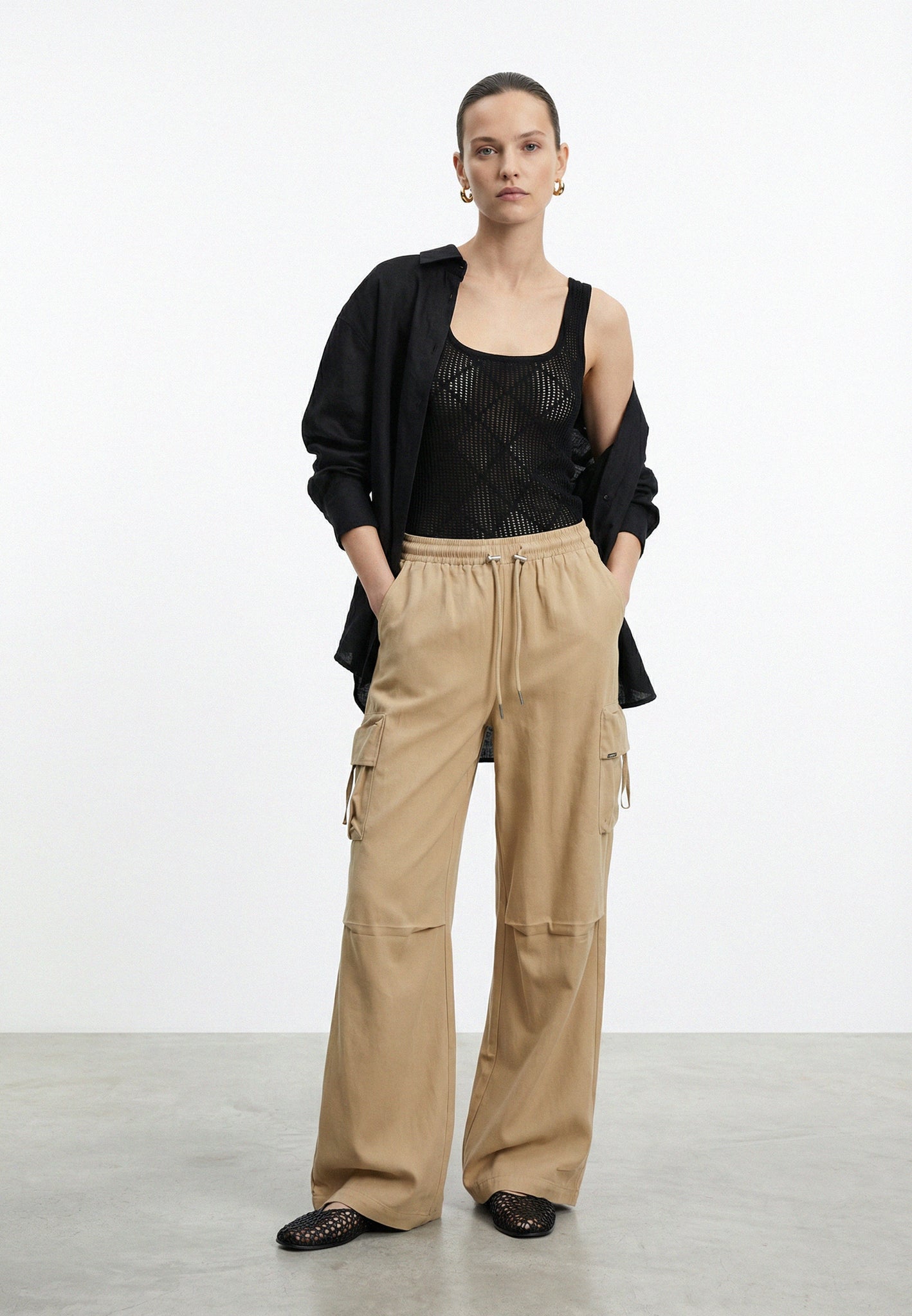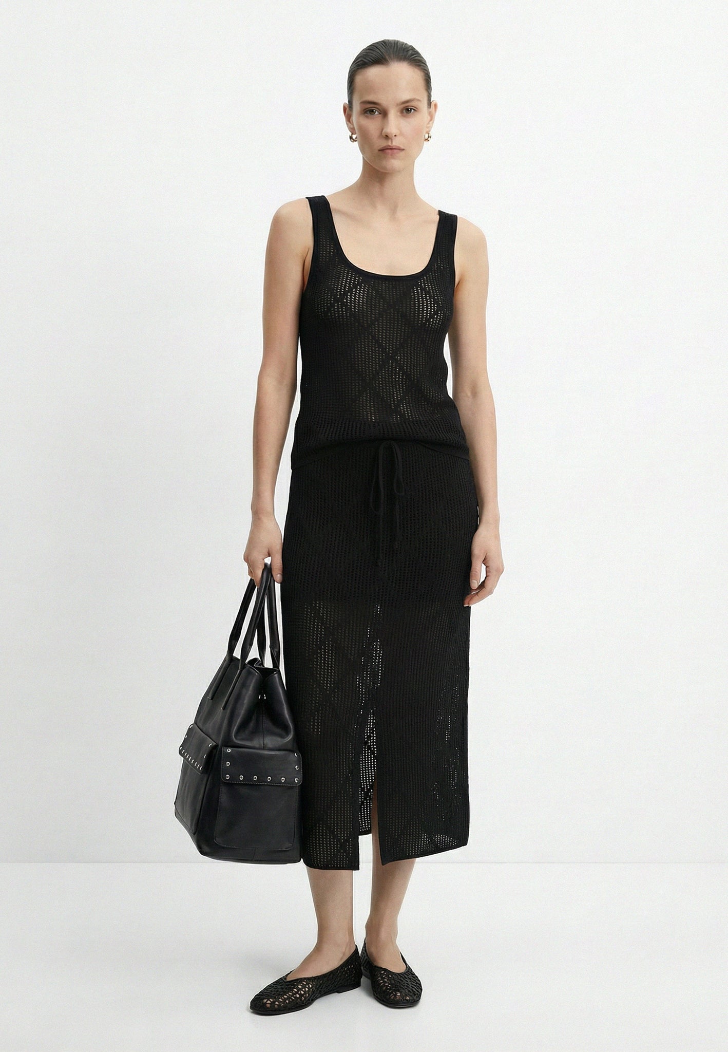 Questo top a canotta conquista con la sua maglia traforata a motivi a losanghe, definita da una vestibilità aderente che mette in risalto le forme senza costringerle. Lo scollo tondo e l'orlo leggermente stondato strutturano la silhouette, lasciando intravedere la pelle.
