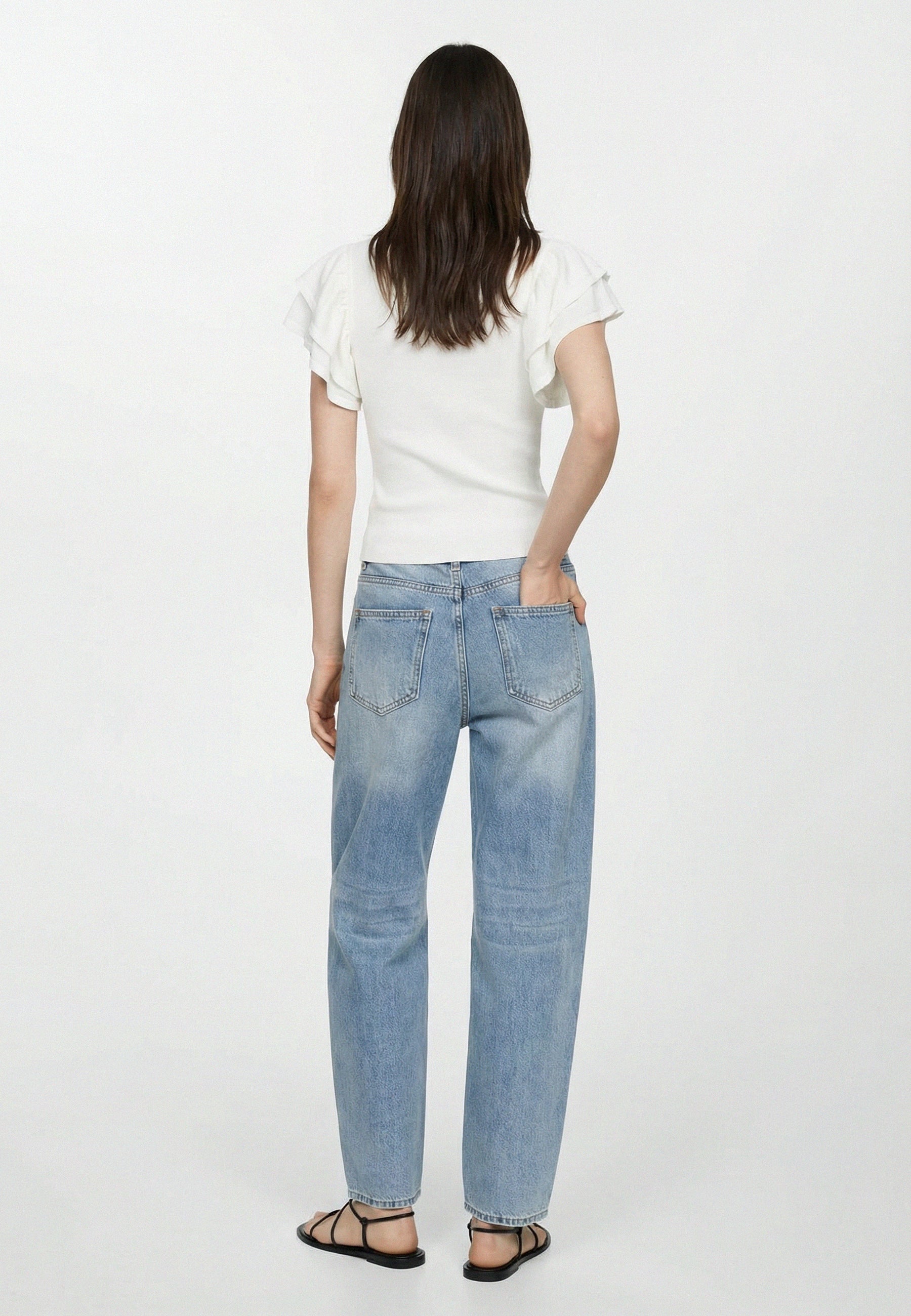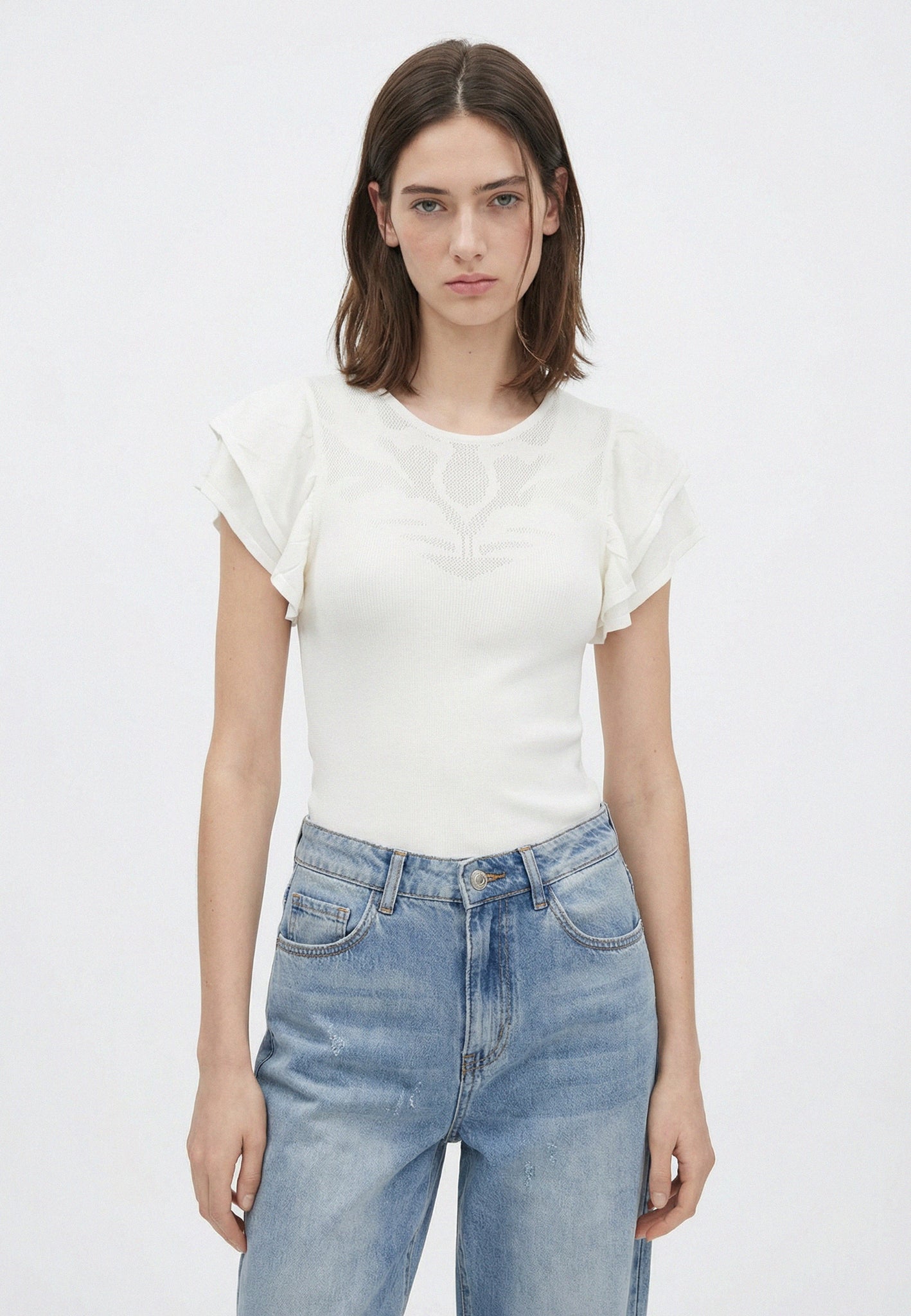 Questo top di maglia in misto viscosa presenta una maglia delicata, che alterna una lavorazione a costine con un ricamo jacquard con trasparenze per un sofisticato gioco di texture. Grazie alle deliziose manichette a farfalla, combina raffinatezza e dettagli iconici per rendere i look quotidiani più radiosi.
