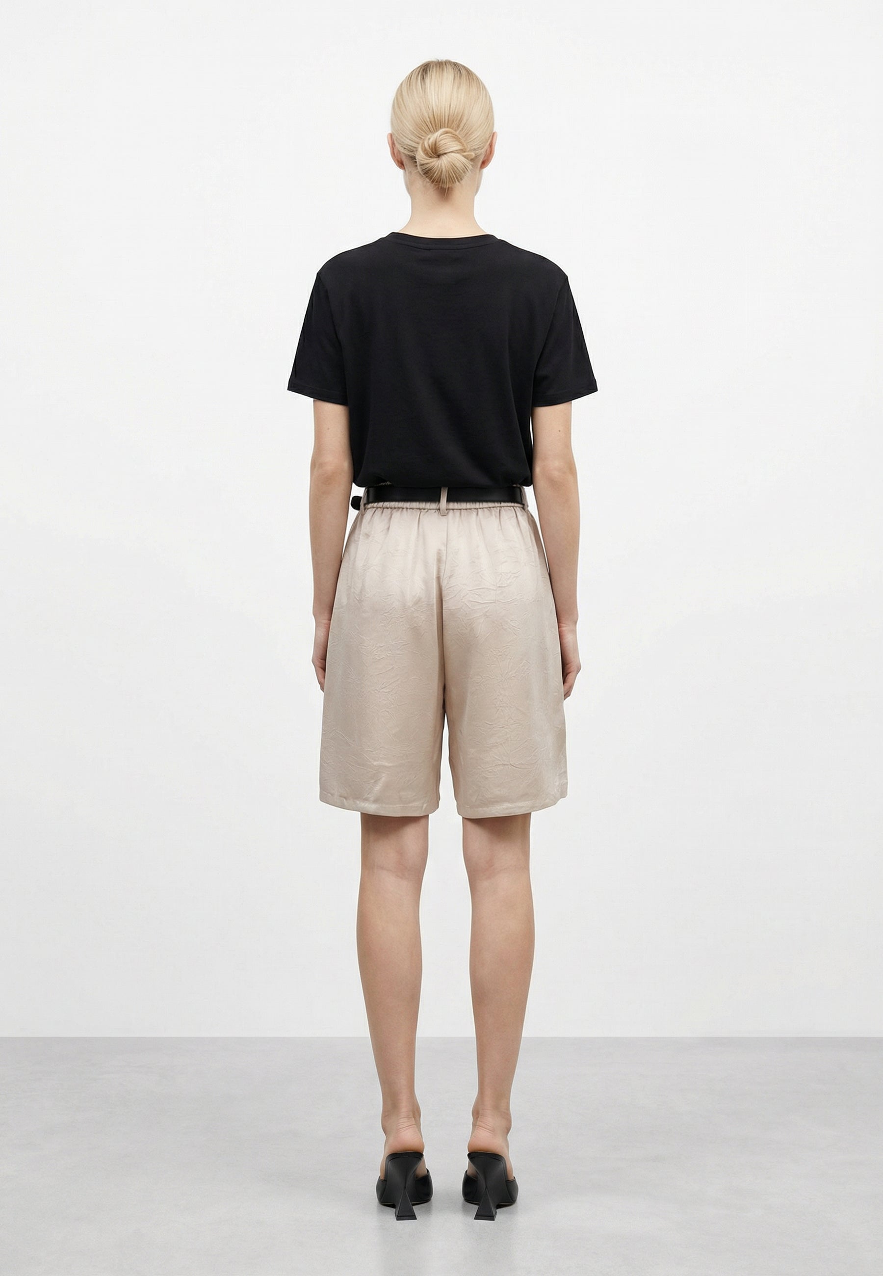 Per un look "quiet luxury" e ricercato, abbinala a un paio di bermuda in rasatello o tessuto lucido nei toni del sabbia. Completa l'outfit con una cintura sottile in pelle e sandali con tacco geometrico per un contrasto di texture moderno ed elegante.