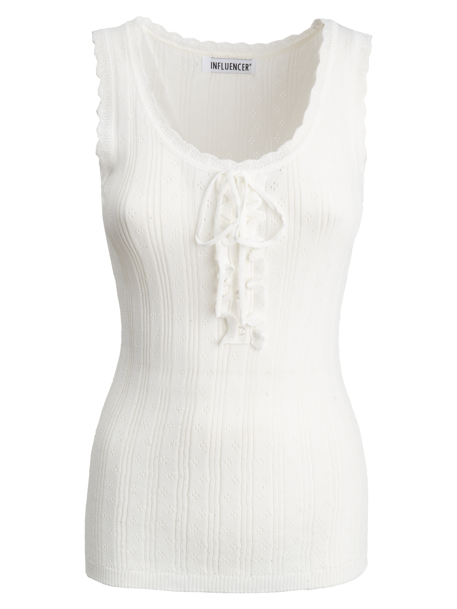Questo top di maglia senza maniche, presenta una raffinata lavorazione a coste e rifiniture pointelle che creano un delicato gioco di texture e trasparenze. Una finta abbottonatura sul davanti con rusches valorizza l'insieme aggiungendo un tocco bon-ton.