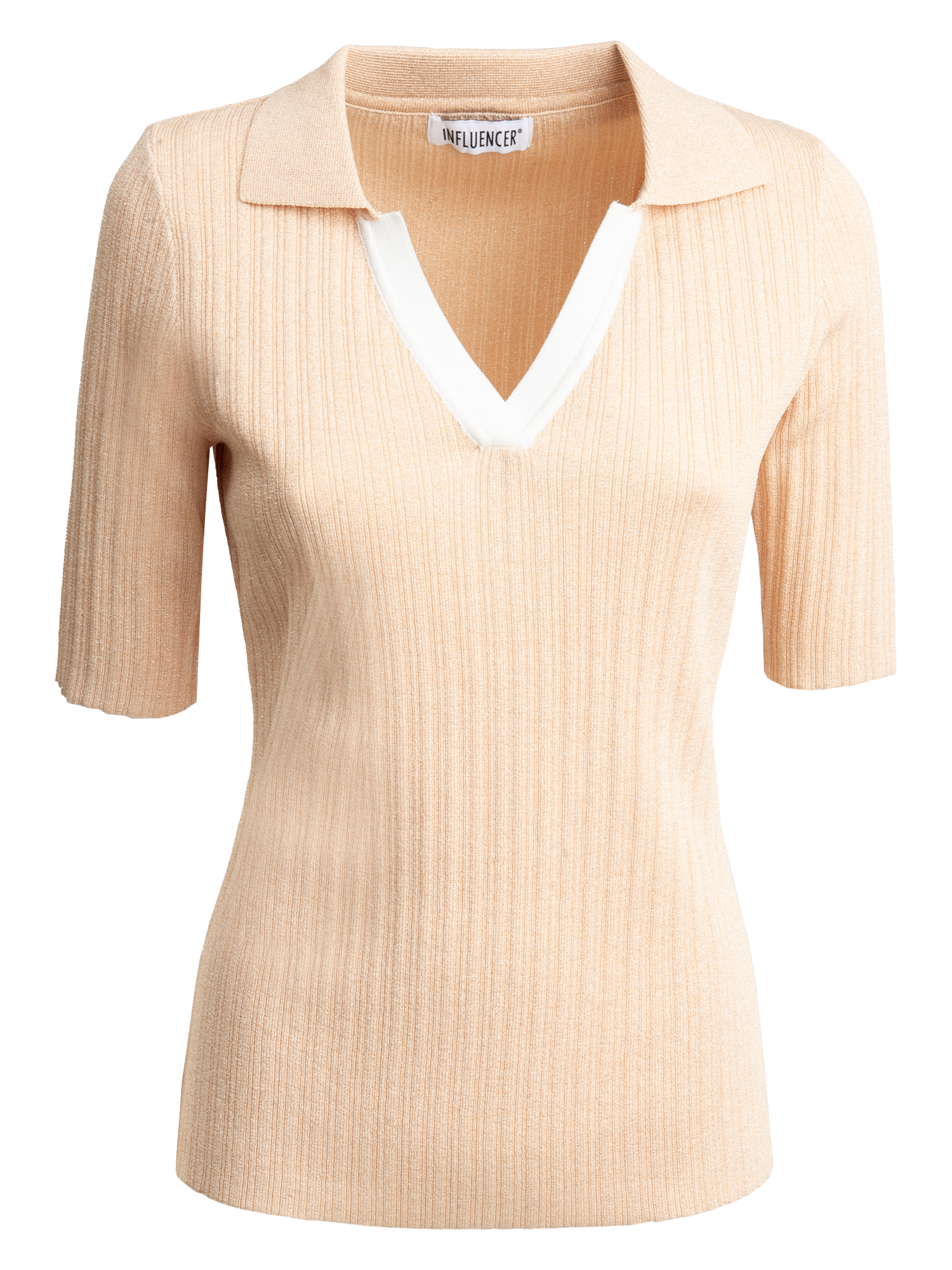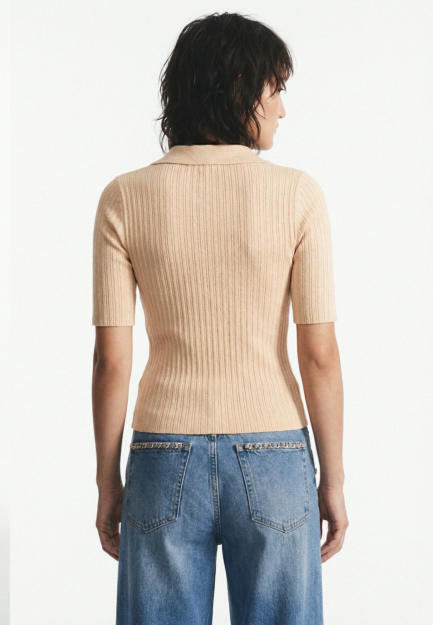 Questa polo in maglia a coste si impone come un capo versatile e contemporaneo da avere nel proprio guardaroba. Il colletto a V a contrasto aggiunge un tocco raffinato. Le maniche a 3/4 e la vestibilità aderente lo rendono un essenziale quotidiano, facile da abbinare a un jeans wide-leg.
