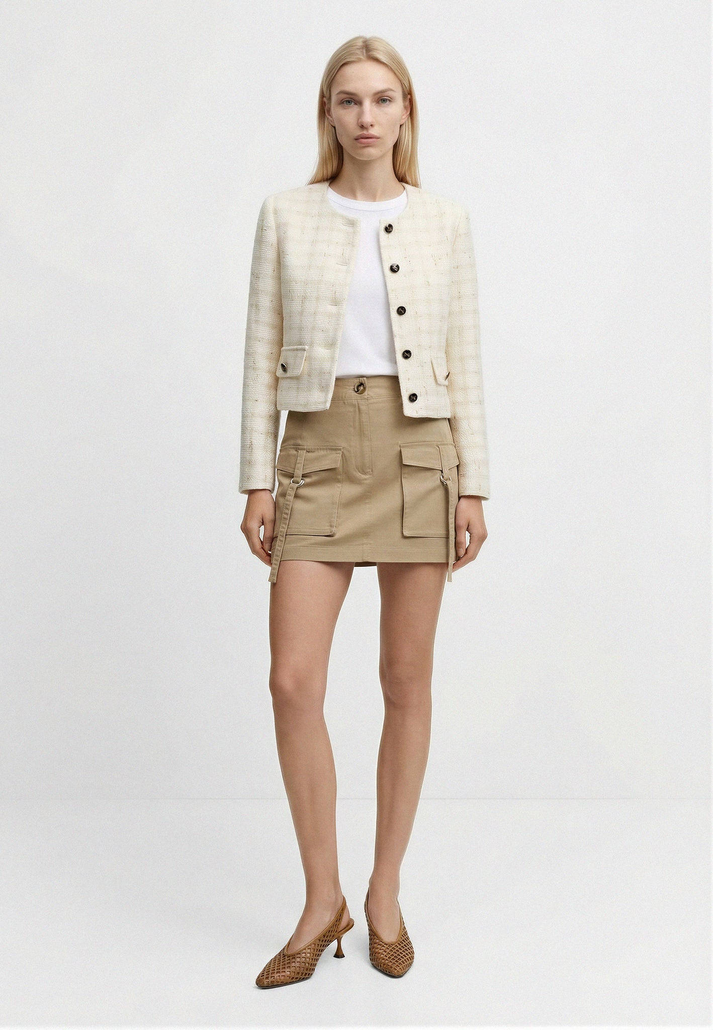 Questa cargo gonna in stile Safari si impone come un capo essenziale del guardaroba di stagione. Le sue tasche a soffietto con patta e i lacci con fibbiette definiscono un look strutturato e femminile, da abbinare a una giacca tweed per giocare con i contrasti. Aggiungi un paio di slingback e una borsetta in eco-camoscio cuoio  per completare il look.