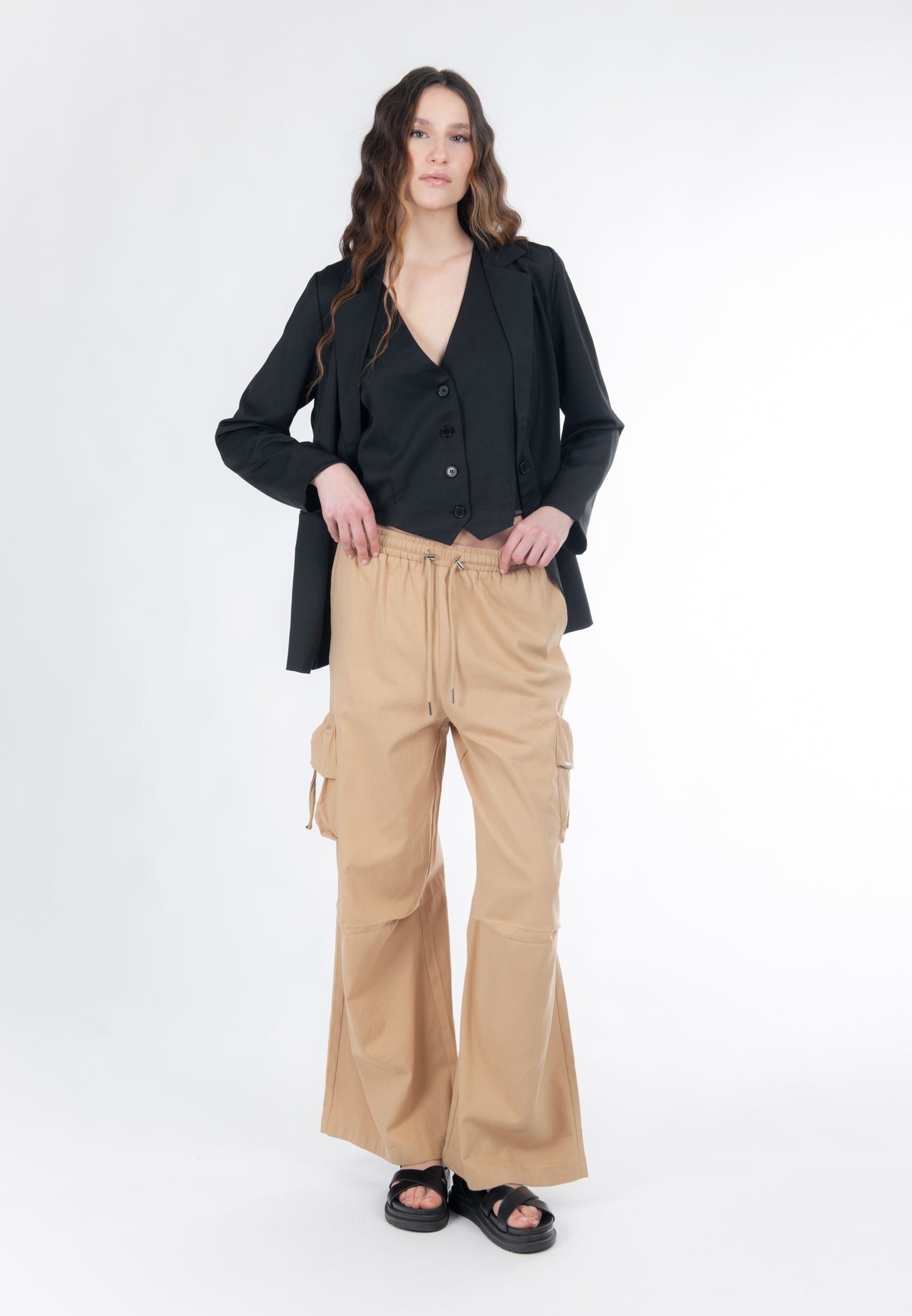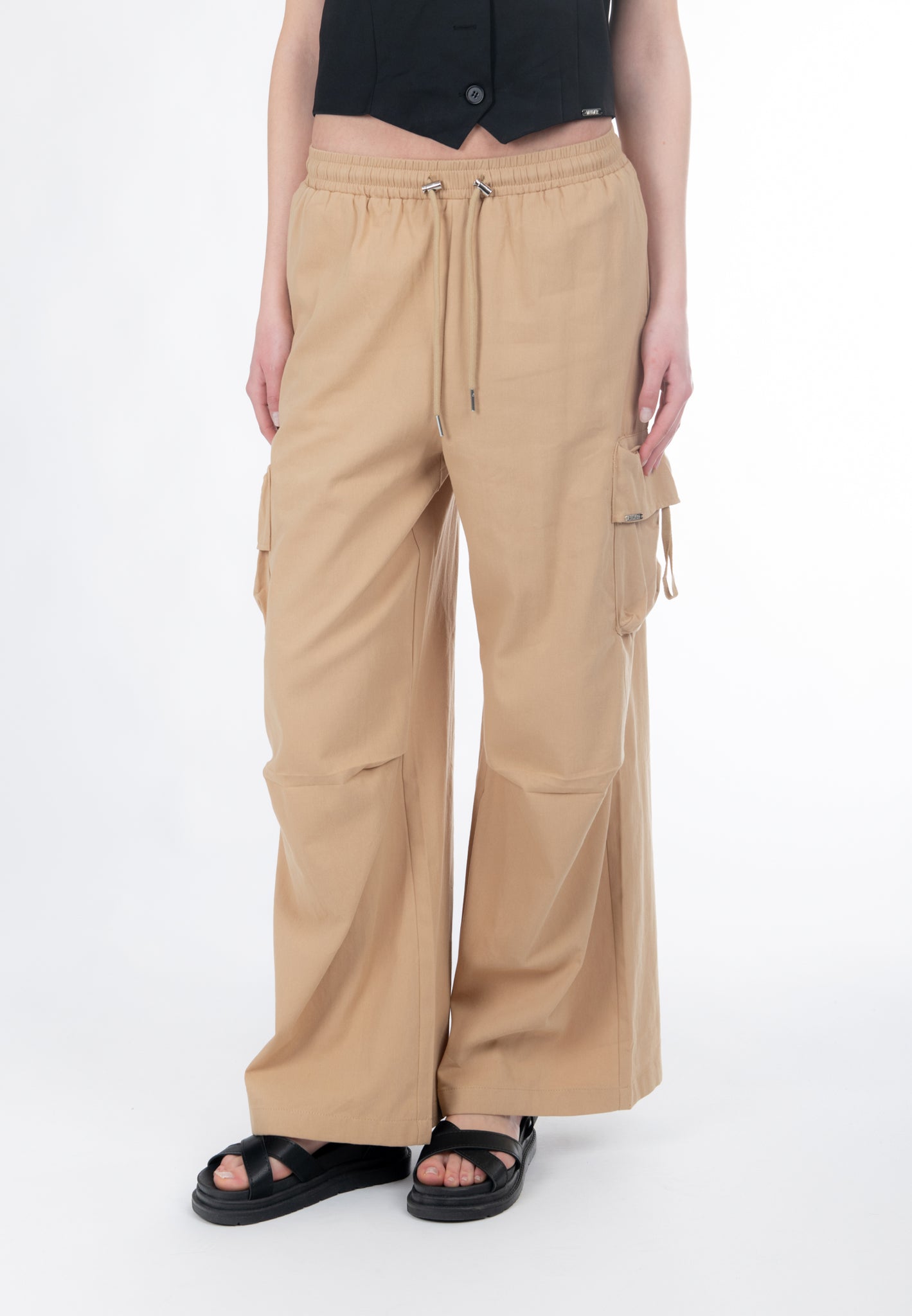 Realizzati in tessuto twill di cotone, questi pantaloni a gamba larga rivisitano con eleganza lo stile casual. Le tasche cargo, arricchite da un herringbone tape in tinta, strutturano la silhouette aggiungendo un tocco contemporaneo. La vita elastica, regolabile con laccetti, garantisce una maggiore aderenza al punto vita, slanciando la figura.