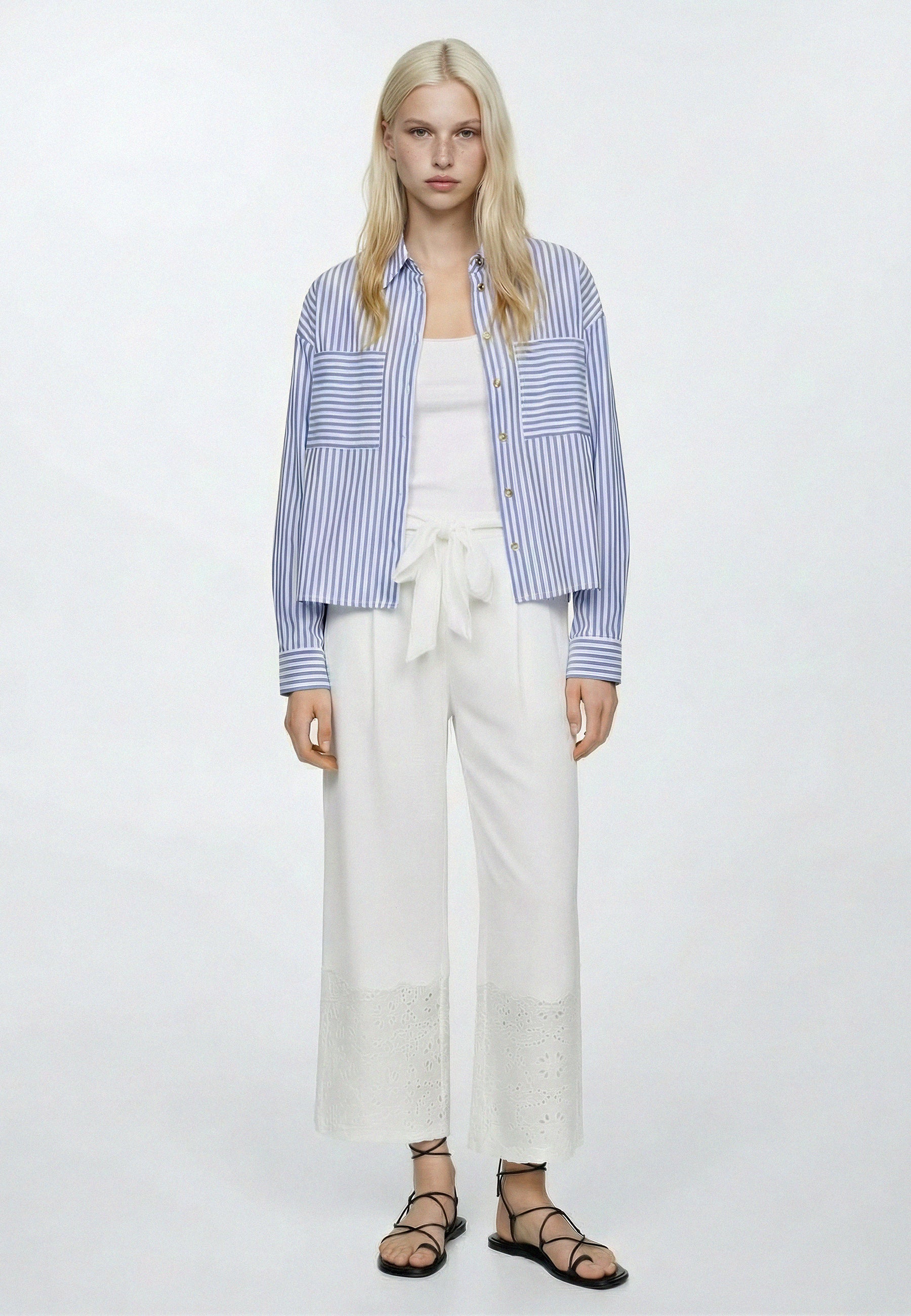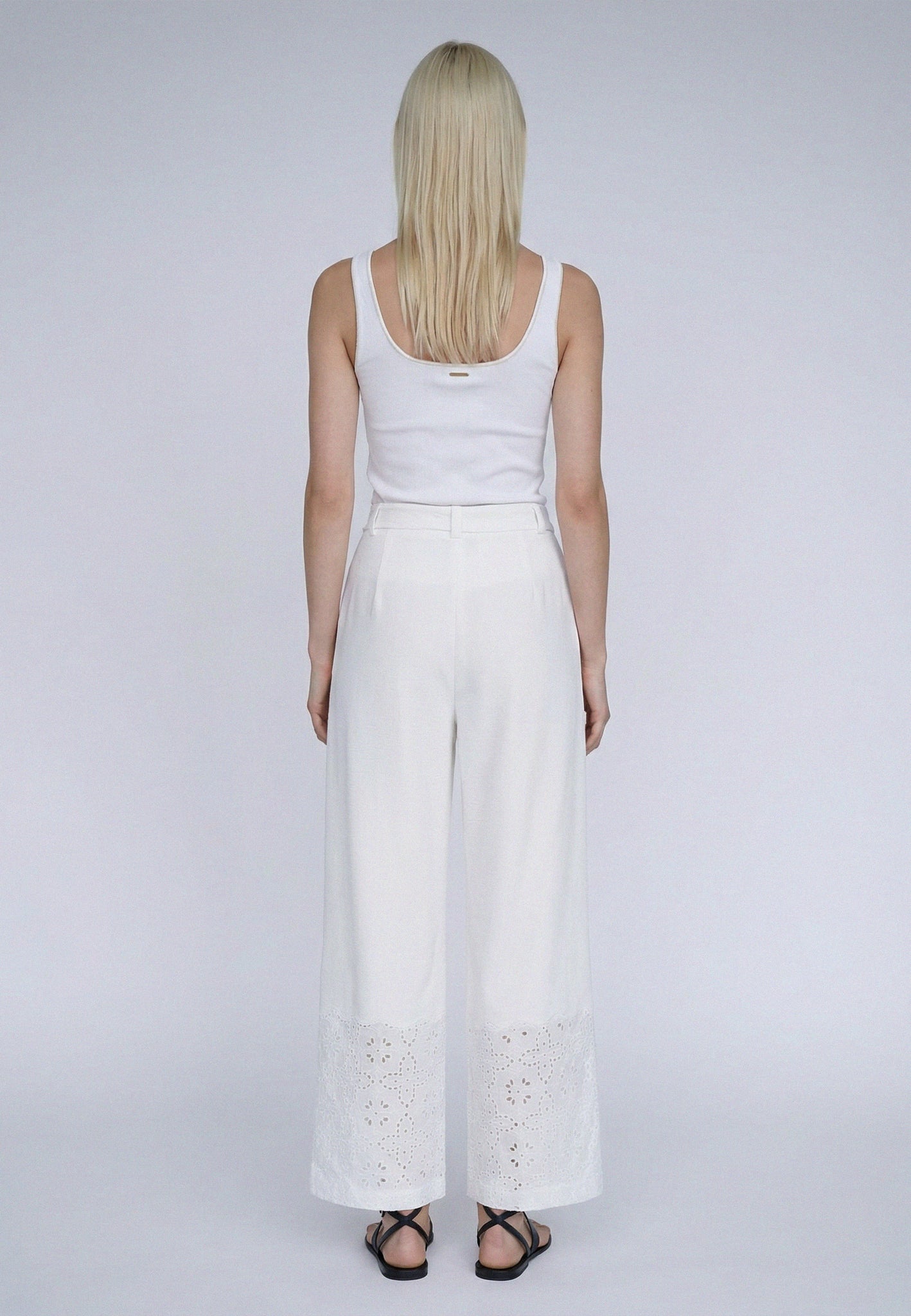 Chic e di grande fascino, questi pantaloni fluidi in viscosa si distinguono per l'ampio orlo in tessuto Sangallo in tinta. Dotati di una chiusura con zip e due tasche laterali, presentano un taglio dritto e un cinturino in vita che permette una delicata annodatura. Indossali con la camicia coordinata per creare un completo frescp ed elegante, completato da una borsa iconica con frange e mocassini che offrono un look sia moderno che casual.