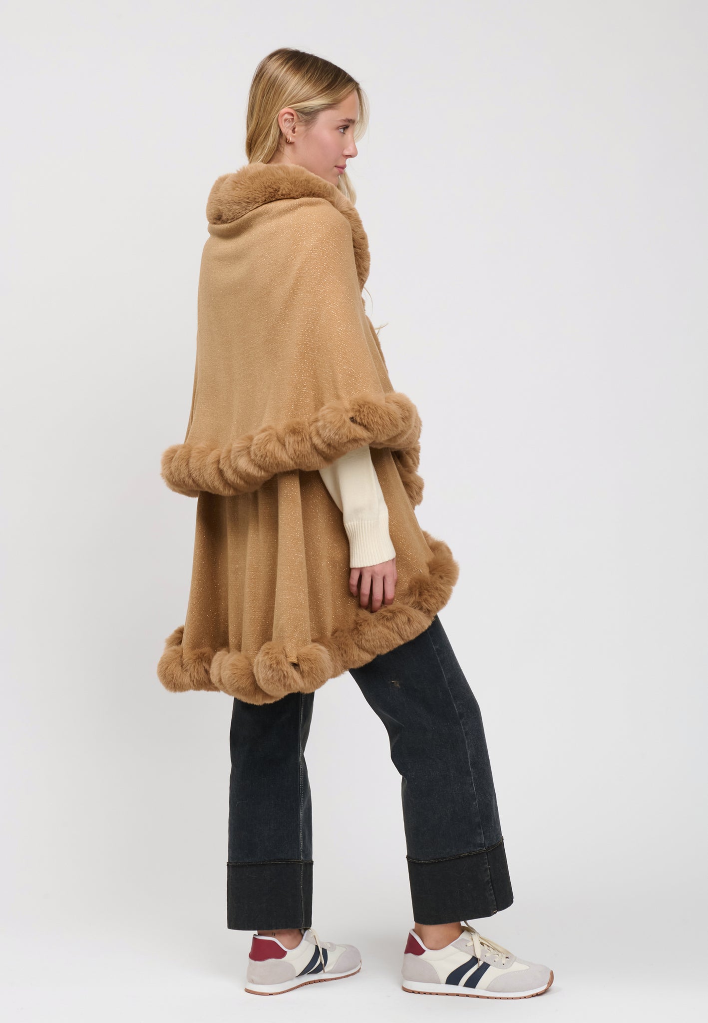 Una mantella di carattere, ideale per i primi freddi o da indossare su un altro capospalla per affrontare il freddo più rigido. Con il suo taglio ampio a doppio livello e le bordature in ecopelliccia, questa ampia mantella avvolge la silhouette in un bozzolo grafico. Le finiture in lurex a contrasto aggiungono un tocco di luce. Indossala con un paio di jeans larghi e una camicia per un look invernale casual e glamour.