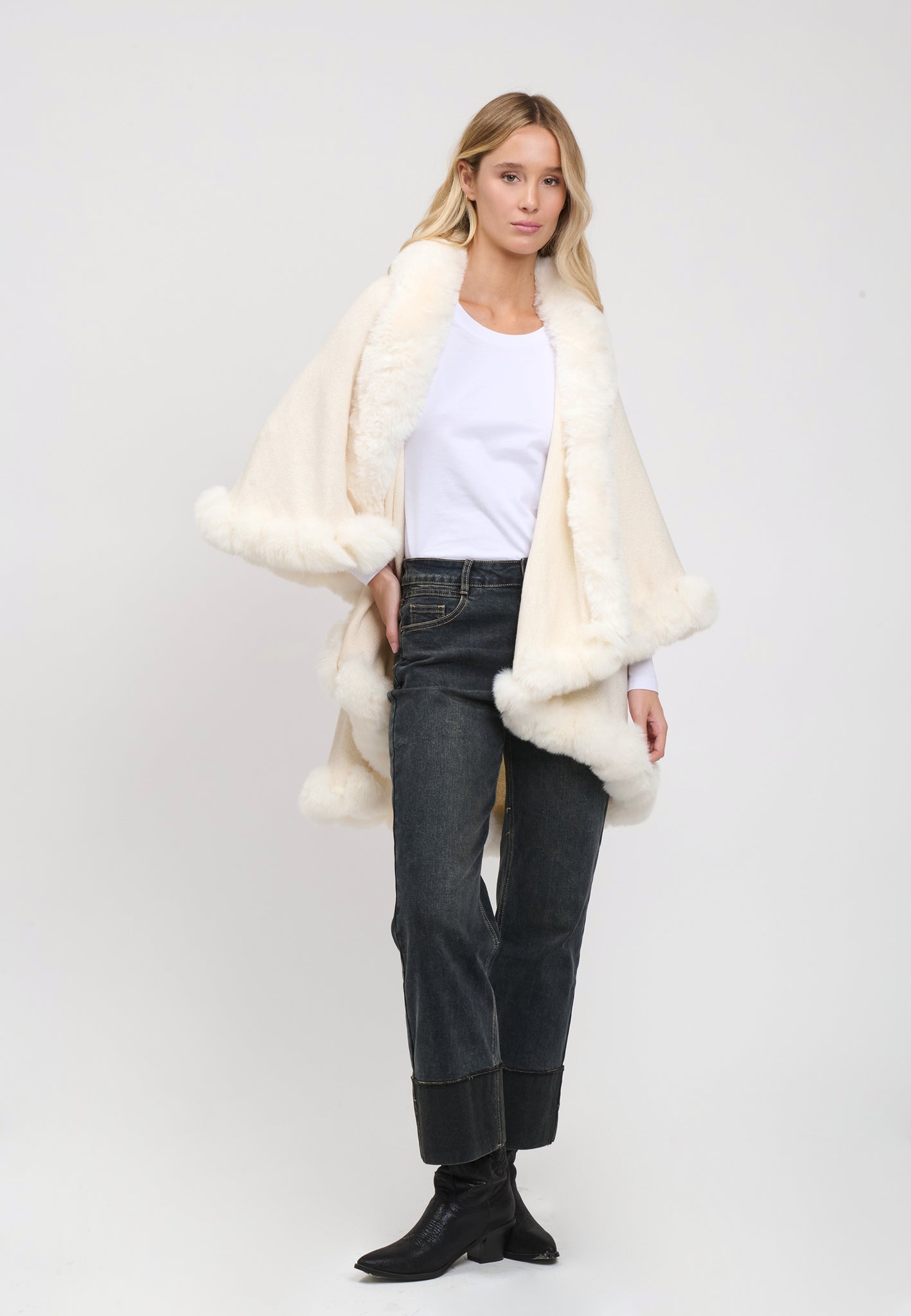 Una mantella di carattere, ideale per i primi freddi o da indossare su un altro capospalla per affrontare il freddo più rigido. Con il suo taglio ampio a doppio livello e le bordature in ecopelliccia, questa ampia mantella avvolge la silhouette in un bozzolo grafico. Le finiture in lurex a contrasto aggiungono un tocco di luce. Indossala con un paio di jeans larghi e una camicia per un look invernale casual e glamour.