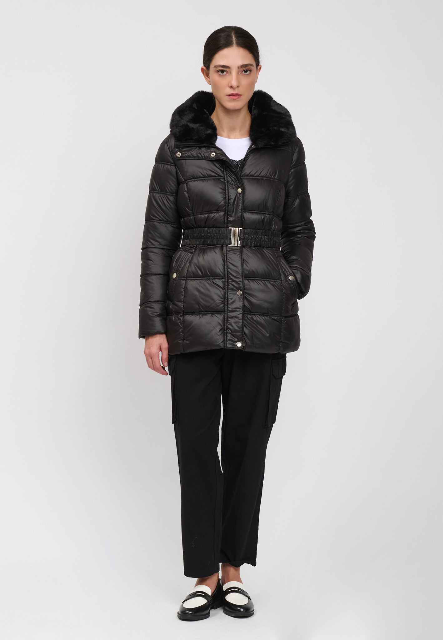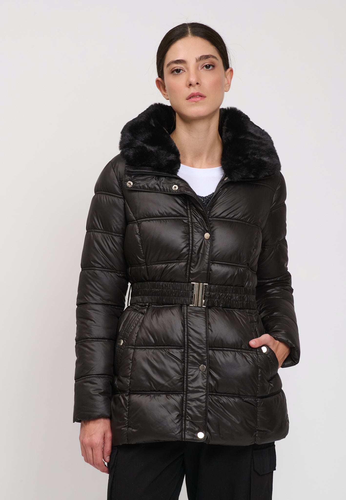Un piumino midi dalla silhouette strutturata, ma al tempo stesso caldo e confortevole. La trapuntatura orizzontale e la calda imbottitura lo rendono perfetto per le giornate invernali più rigide, mentre il collo rimovibile in ecopelliccia in tinta aggiunge un tocco rétro chic. La cintura elastica sottolinea la vita per un look femminile, strutturato e intramontabile. Da indossare con un maglione in tinta con ampio collo morbido e stivali alti per un look confortevole e invernale.