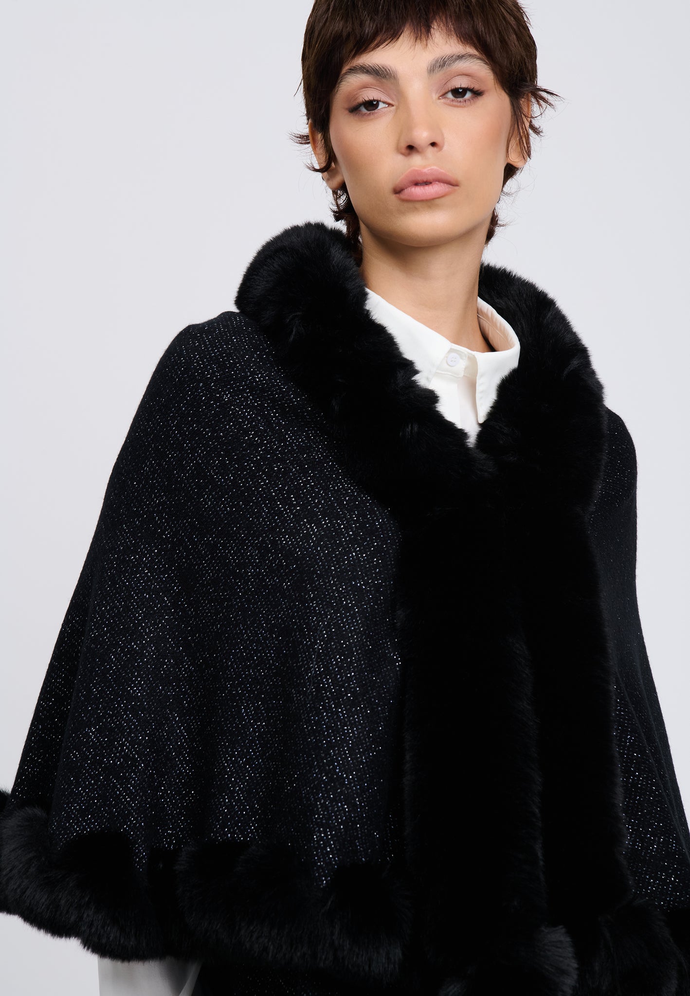 Una mantella di carattere, ideale per i primi freddi o da indossare su un altro capospalla per affrontare il freddo più rigido. Con il suo taglio ampio a doppio livello e le bordature in ecopelliccia, questa ampia mantella avvolge la silhouette in un bozzolo grafico. Le finiture in lurex a contrasto aggiungono un tocco di luce. Indossala con un paio di jeans larghi e una camicia per un look invernale casual e glamour.