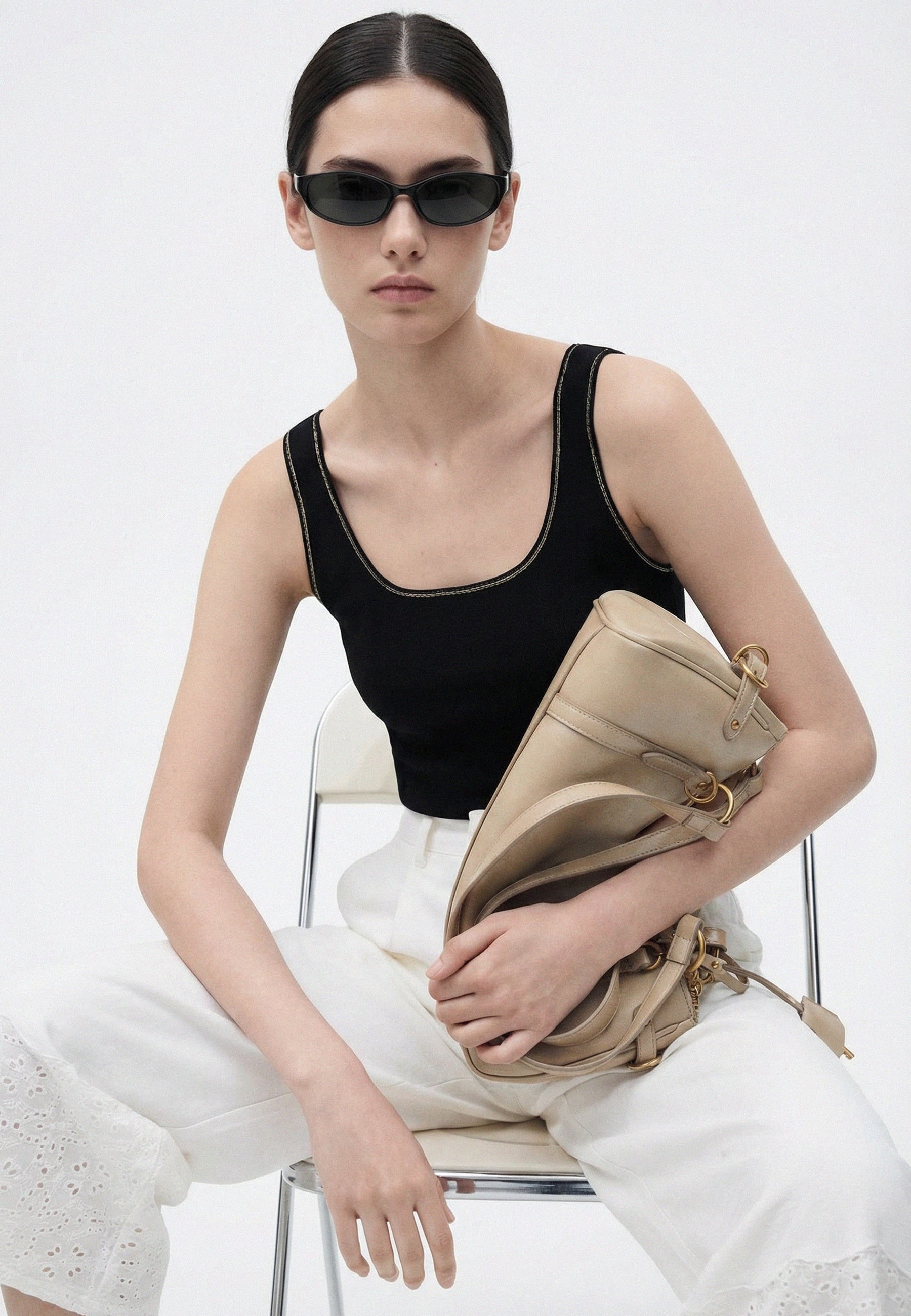 Il design pulito e minimalista è arricchito da un sottile profilo dorato lungo lo scollo e i giromanica, che aggiunge un tocco di lusso discreto.